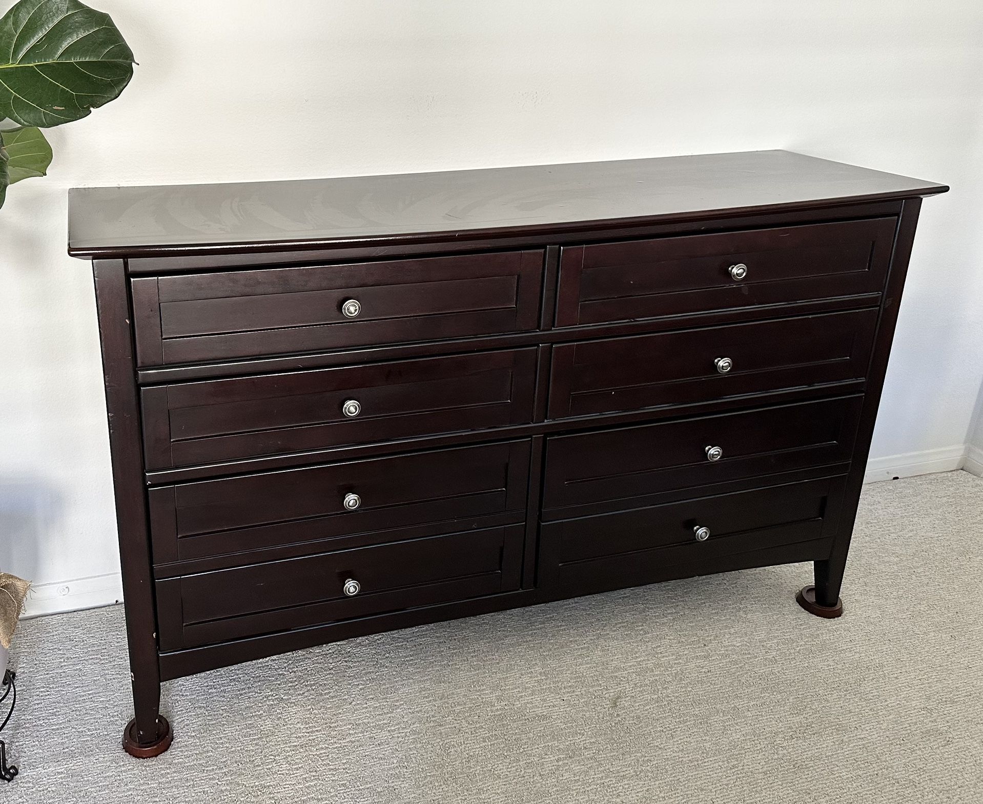 Solid wood 8-drawer dresser in dark espresso finish. Good condition with minor wear from use. Sturdy and functional. Pickup only. Dimensions: 64” W × 38.5” H × 19.5” D.