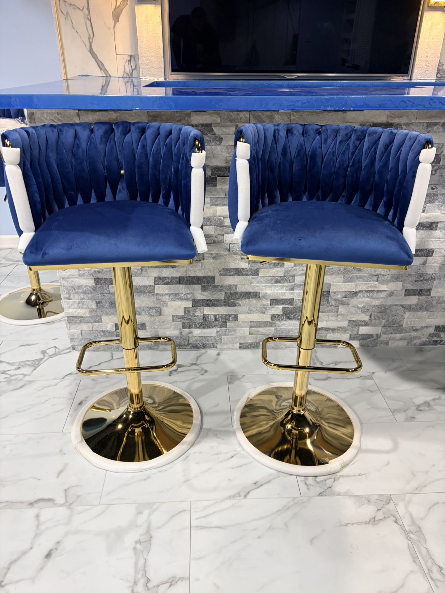 I have 2 new in box. Pictures are ones I built for my bar. Beautiful navy blue velvet with gold trim with full round back. Swivel and adjust up and down. Price is for BOTH barstools as they come in same box.