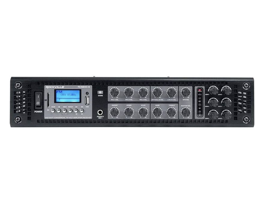 Rockville RCS650-6 650 Watt 6-Zone 70V Commercial Amplifier, Bluetooth, USB/SD/FM Playback, Rack-Mountable, for Restaurants & Offices