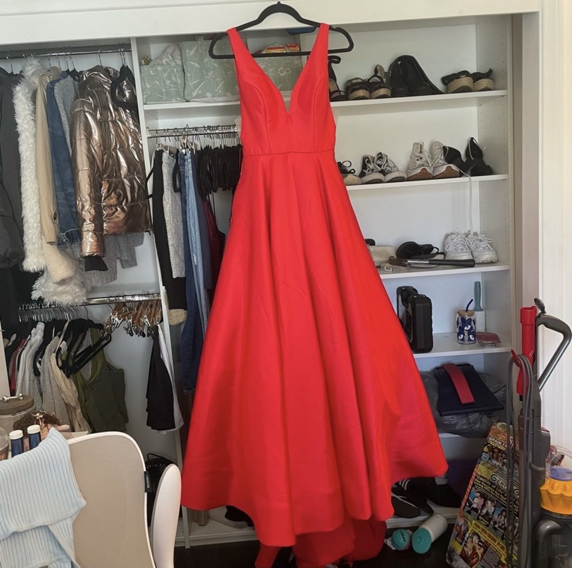 Size 0 Good condition Needs to be dry cleaned Worn once and haven’t cleaned of dress since prom 2018 I adjusted dress to fit my height 5’3” with heels. 34B taken in to fit chest as well Reduced price due in needing to be dry cleaning on bottom