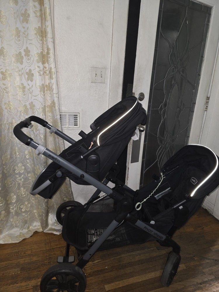 Double stroller evenflo pivot Have used over the passed 2 years Great stroller my twins no longer fit in it Stroller is color black , the basket has a white stain, and one of the canopies is a little down please check out the pictures I also have the car seat im selling everything for $160 or best offer it comes with the 2 seats and 1 carseat that goes with the stroller