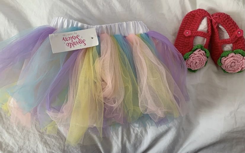 baby tutu rainbow for phpto shoot 6-12 Months and pink floral crocheted booties baby tutu rainbow for phpto shoot 6-12 Months and pink floral crocheted booties. Both brand new, never used. Smoke and pet free home,