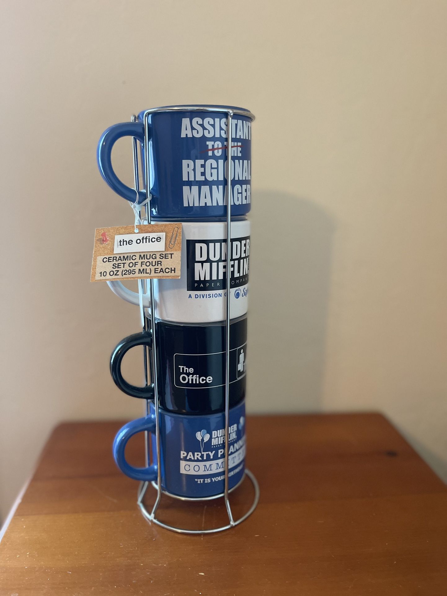 “The Office" 4 Coffee Cup/ Mugs Complete Set Stackable Metal Rack