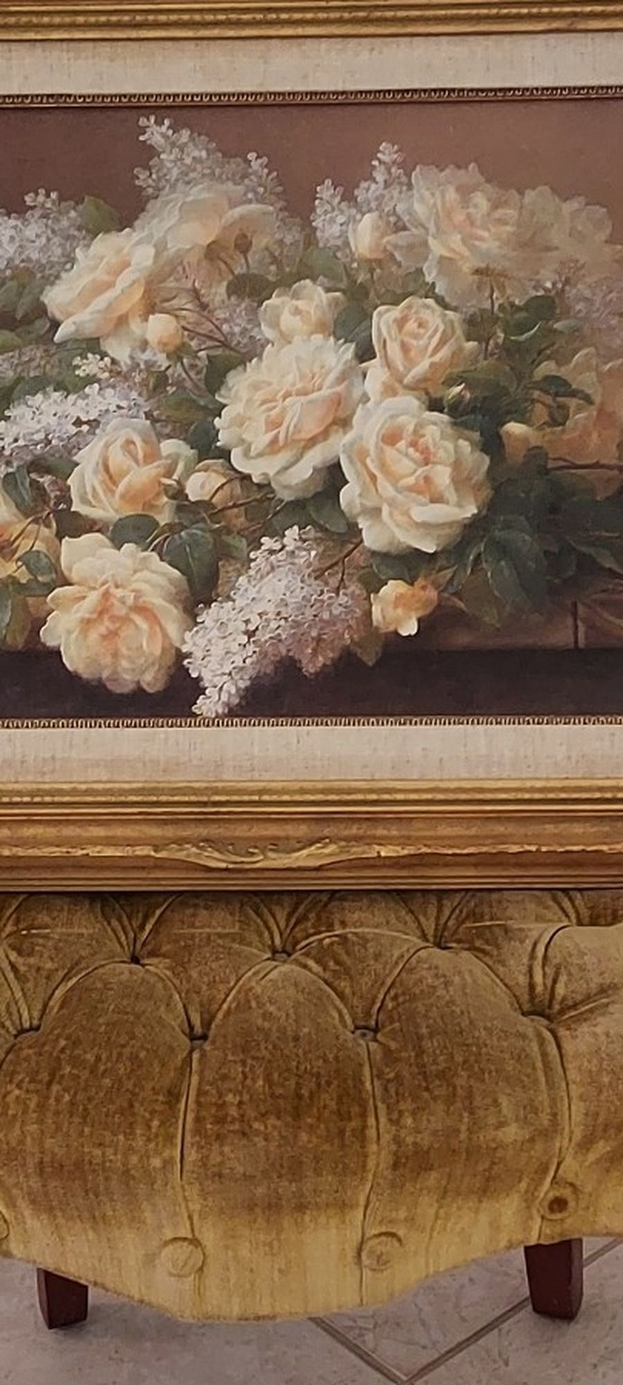 Gorgeous painting of beautiful Cream And Pale Yellow Roses And White Lilacs in gilded frame. Great for romantic home decor, photo shoots, and wedding decor. 18 X 24.
