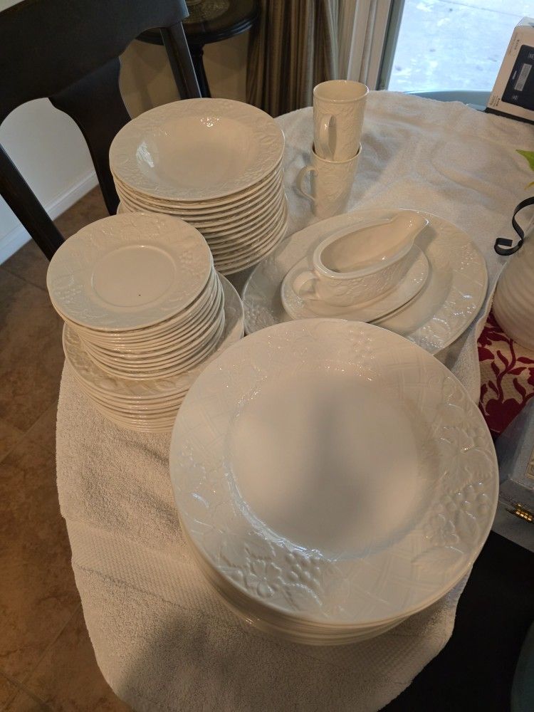 15 dinner plates, 12 soup bowls, 11 salad plates, 13 saucers, 2 large bowls, 1 lrg serving plate, 1 gravy boat, 2 gravy boat under plates, 1 creamer, 2 tall mugs. All in very good condition, some never used.
