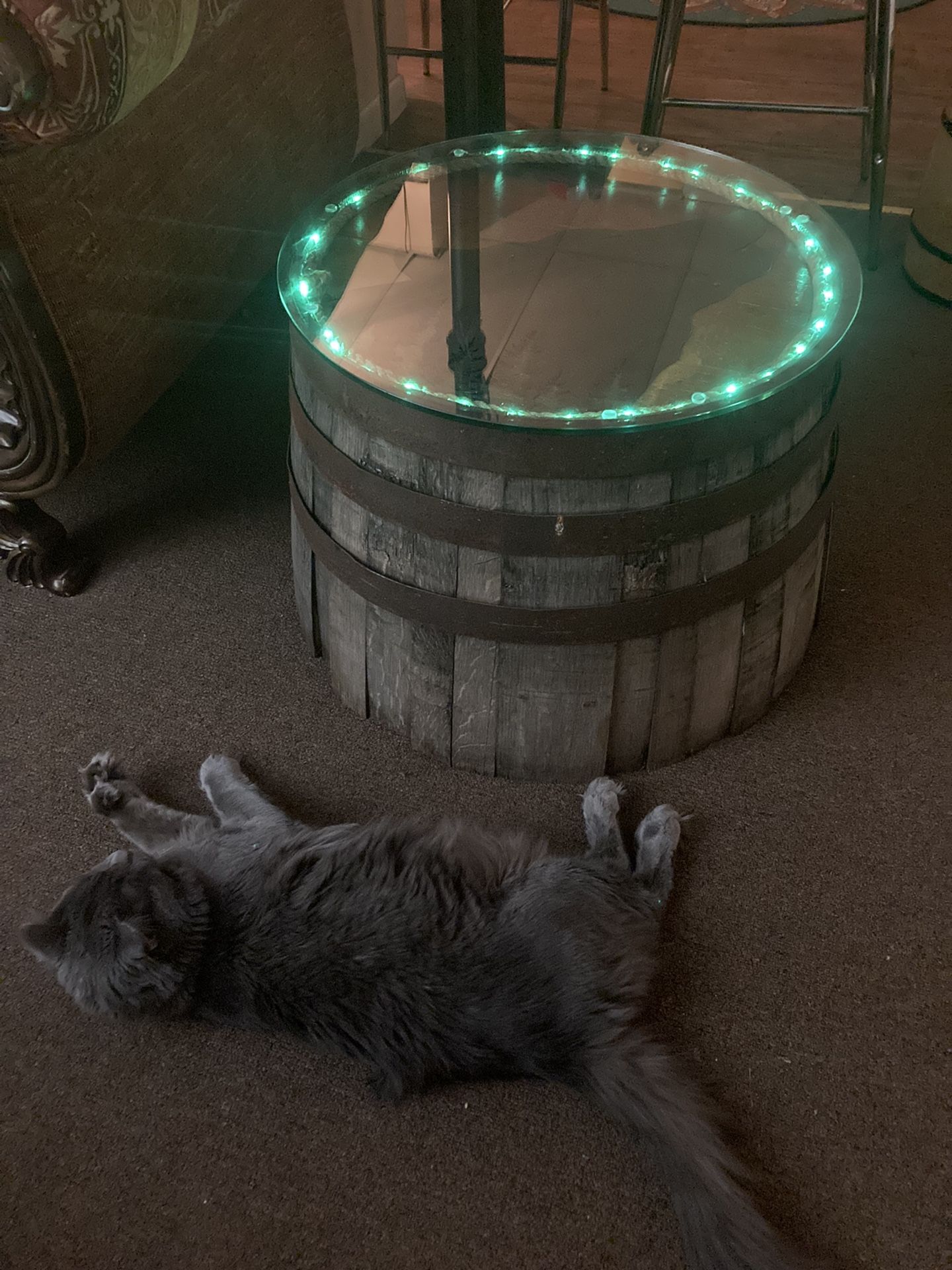 This is a 1/2 whiskey barrel table that has been custom built. It’s perfect for indoors or outdoors. It has green, fixed in place, LED lights. Sturdy and cool for a rustic furniture piece.