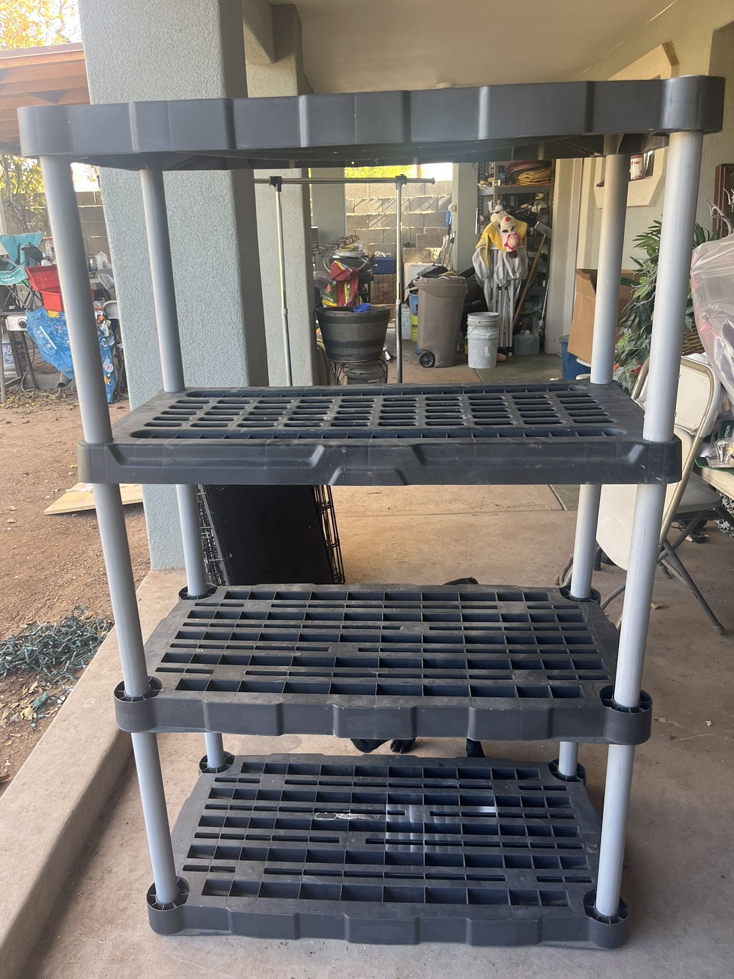 Plastic shelf, dimensions 35”x17”x55” tall $15.00.