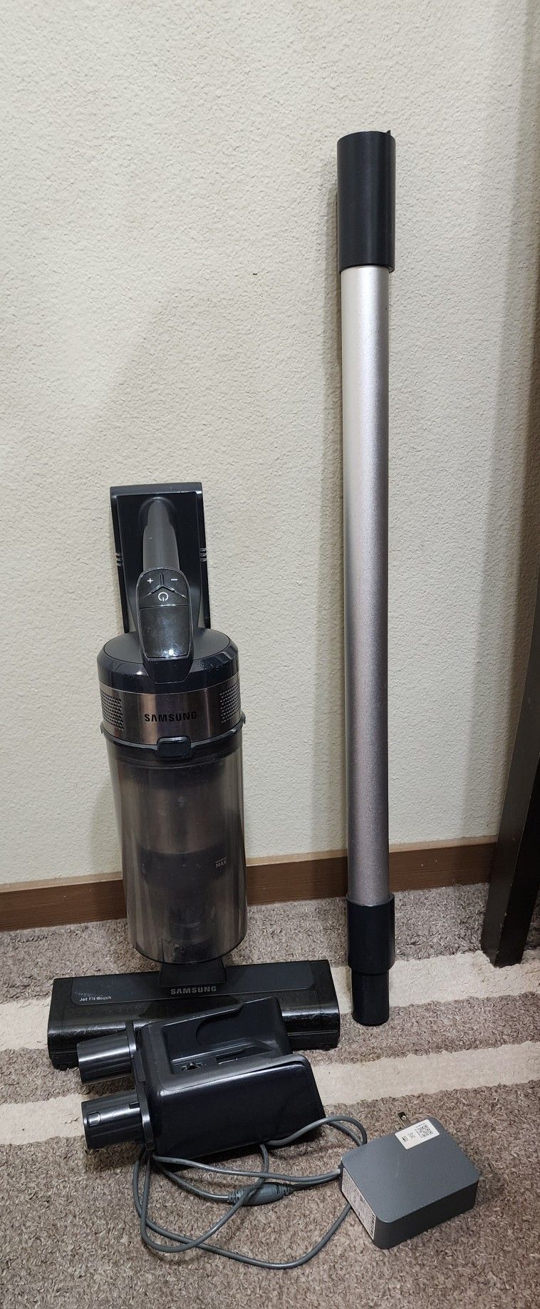 Samsung Cordless Vacuum. Includes charger. Works great. Please look at pictures 10 and 11. There is a tine part that takes a part, but when you put it together, it holds great and works great as well.