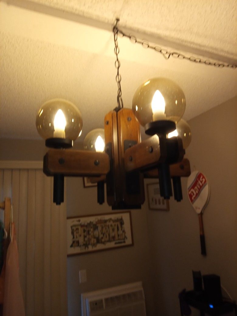 Vintage Post Modern swag lamp chandelier. Four globe lamps and one bulb at the base provide ample light. Smoked glass globes diffuse the light. Solid wood frame with black metal accents. Long chord with plug is wrapped in chain. Clip the chord to install the chandelier to a ceiling switch. Dimensions 21.5″ Diameter x 14.5″ High Lamp is in excellent working condition.