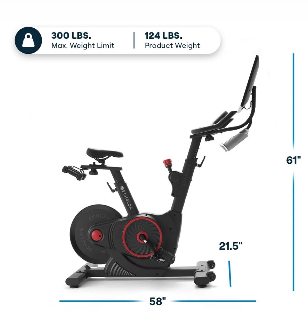 Echelon stationary bike with interactive 22inches screen. Connect EX-5s-22 (Like new and never used). Unmatched Innovation. Designed with comfort in mind the Echelon EX-5s-22 features a vented competition-style seat, and adjustable seat & handlebars for optimal riding position. This model includes a 22" HD touchscreen display that delivers immersive, studio-quality fitness experiences from the comfort of your home. EX-5s-22 Features & Specs: 22” HD Touchscreen Display Screen Flips 180° for Off-Equipment Workouts 32 Magnetic Resistance Levels Padded Bullhorn Handlebars Dual Sided SPD Shoe Clips with Toe Cages Adjustable Handlebars & Seat up/down or forward/backward Vented Competition-Style Seat Rear-Mounted Dumbbell Holders Total Equipment Size: 58" L x 20" W Max User Weight: 300lbs (2) Water Bottle Holders Customize your ride by setting resistance for your flat road, hill and climb in the Echelon Fit® App. Simply click a button, and your bike will automatically adjust to your desired levels. If is posted means still available, great gift for early Christmas and to stay in shape during the holidays!