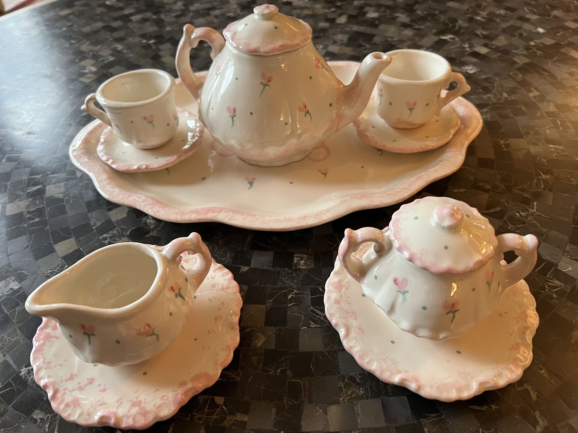 Child’s hand painted ceramic tea set with pink/ green flowers . Excellent condition. No chips. Rarely used. Includes serving tray, 2 tea cups/saucers, 1 teapot, 1 creamer/saucer, 1 sugar/saucer