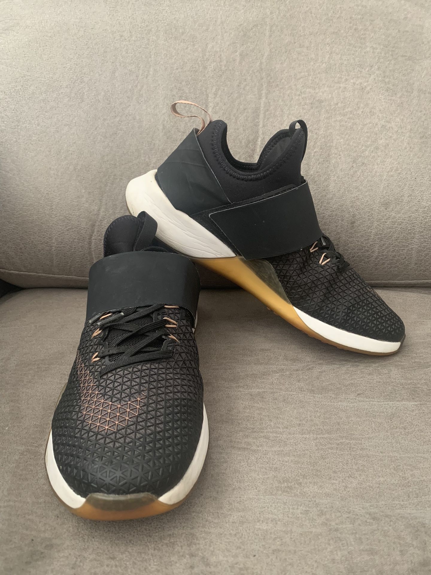 (WMNS 10) Nike Air Zoom Strong 'Black/Rose Gold/Bronze' Athletic Sneaker. In good condition no rips or tears. See all pictures for more details.