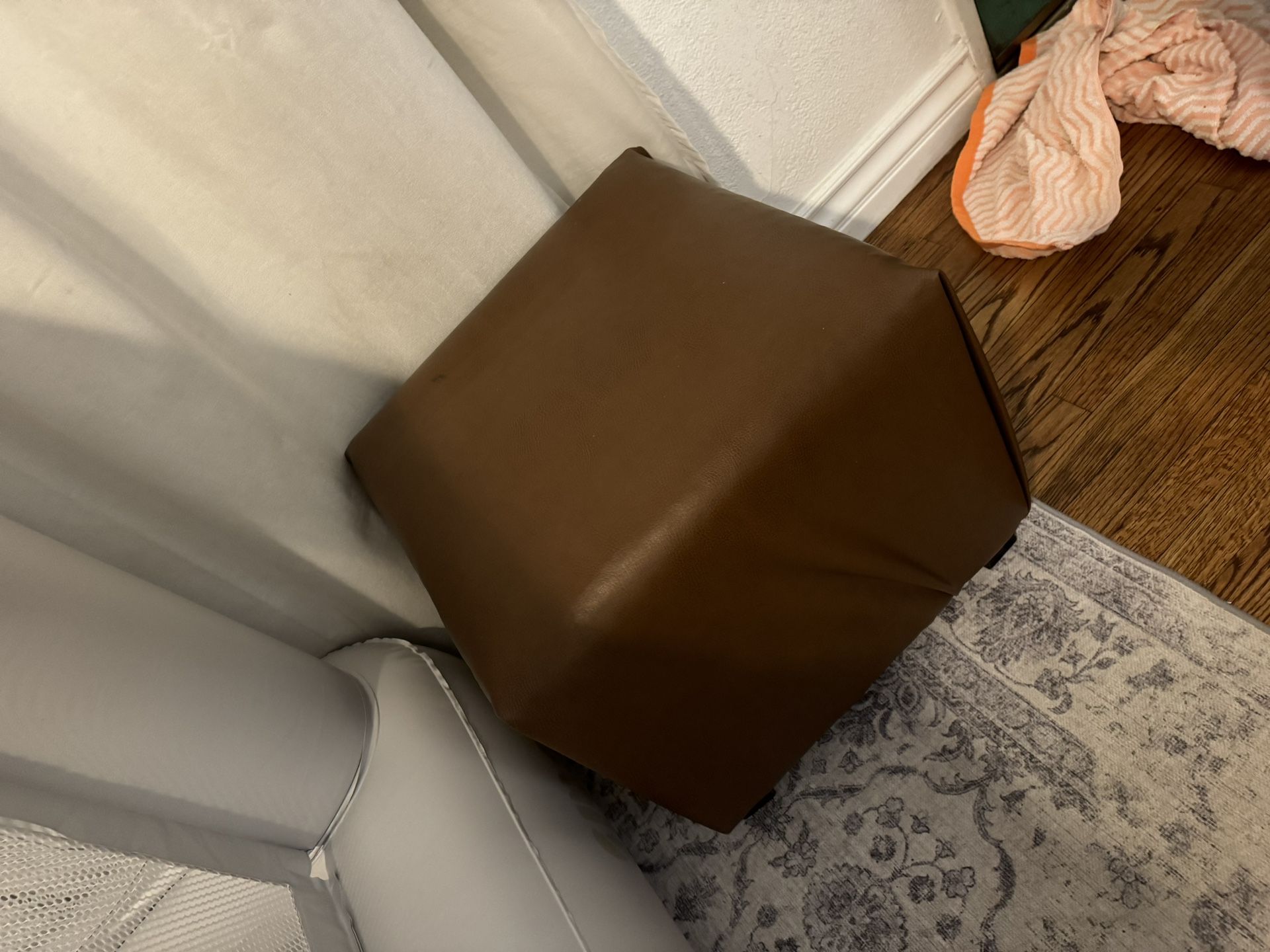 Ottoman I reupholstered it but underneath it’s a vintage black and white pattern.