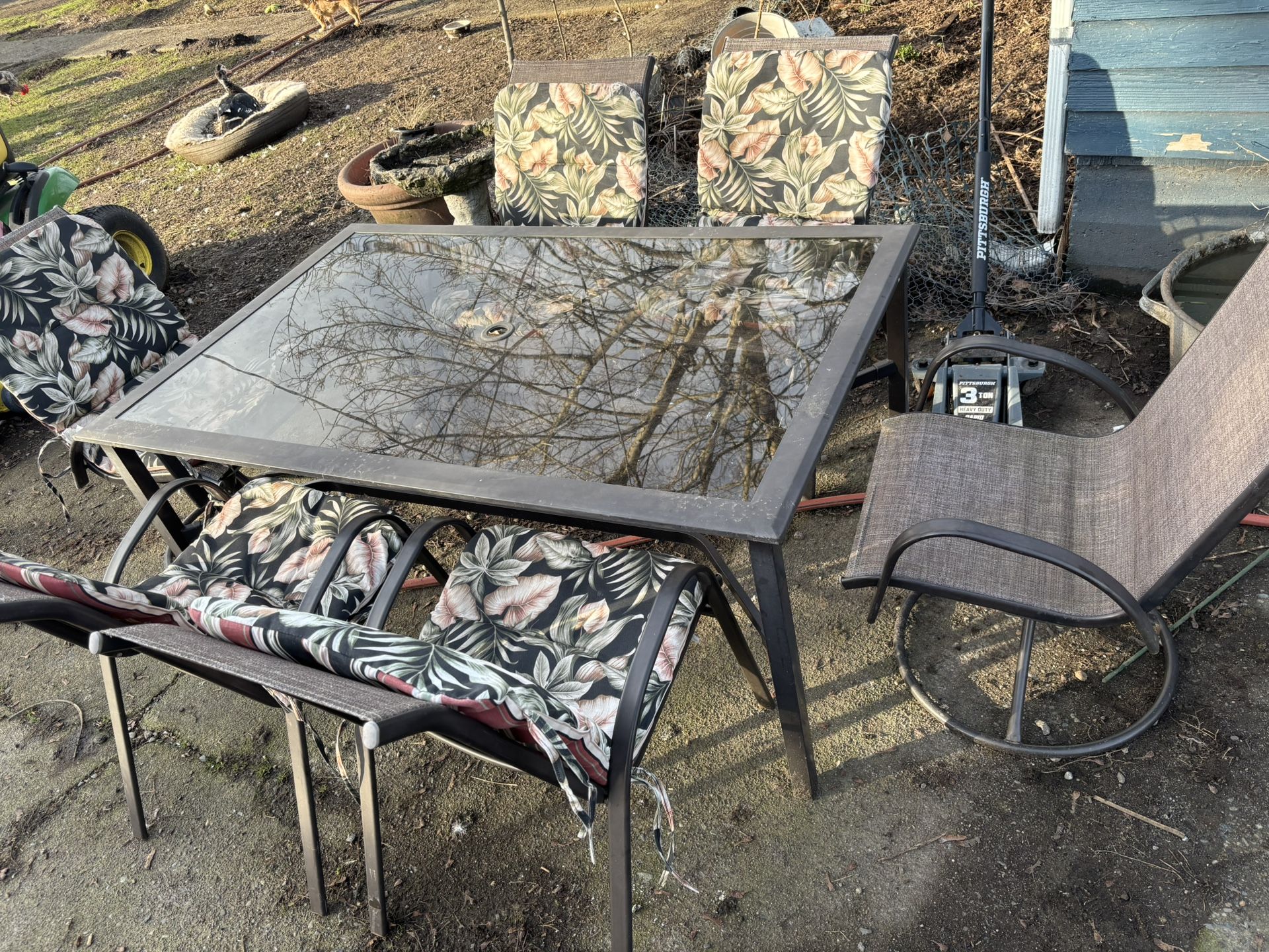 Patio furniture set Comes with 6 chairs 5 are in good condition 1 is in fair condition has a rip in it but not a big deal they come with 5 cushions Two end chairs turn The others will stack