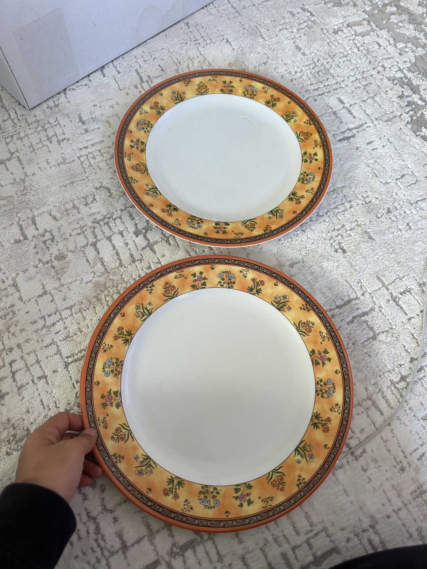 Set of 2 decorative dinner plates with warm floral border design. Perfect for everyday use or display. ✔ Set of 2 plates ✔ Elegant floral rim ✔ Neutral center for versatile use ✔ Approx. standard dinner plate size ✔ Daniel Brand Great condition with minimal wear.