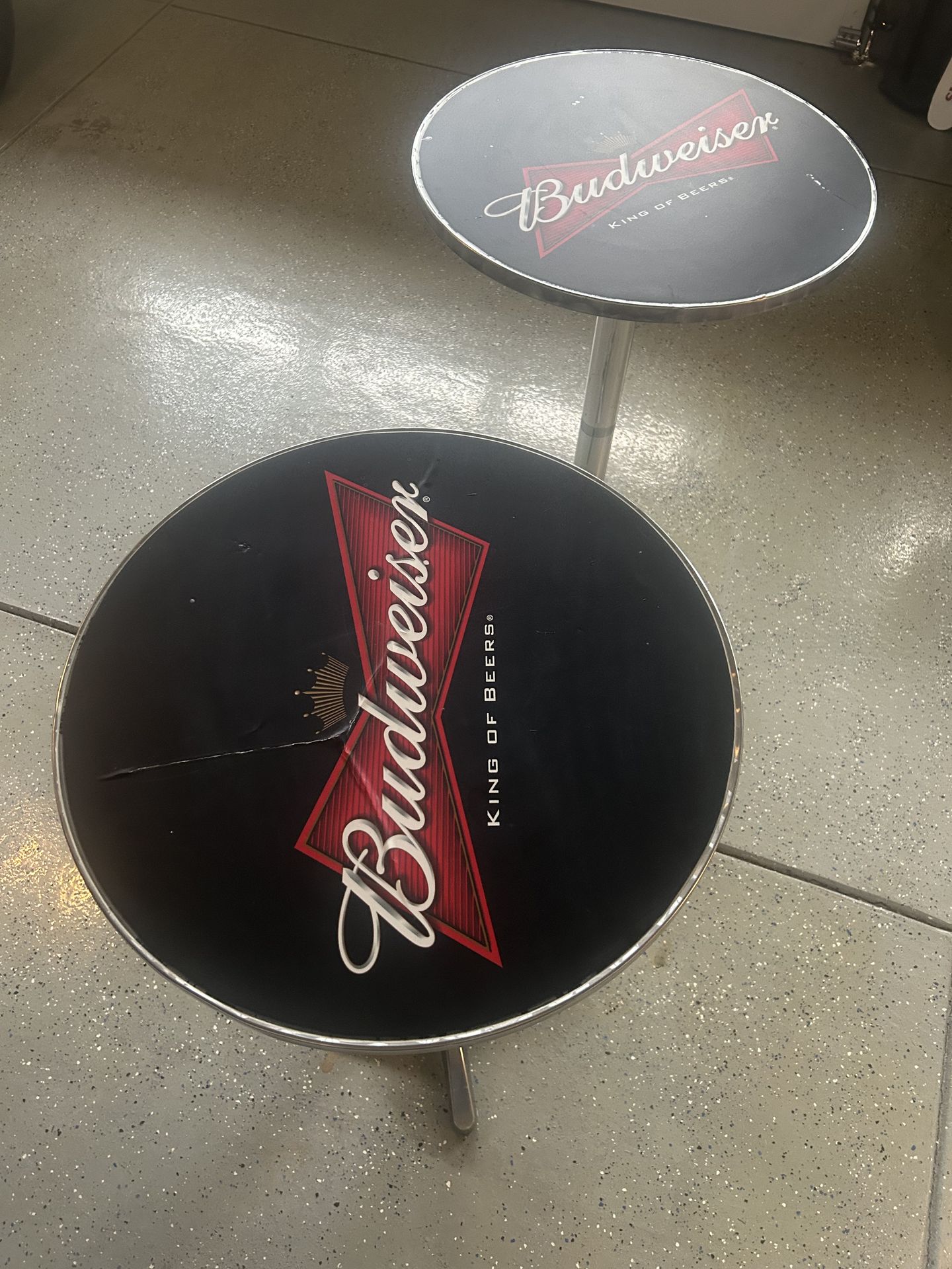 Bar tables in fair condition. Some bubbling on top, could be replaced with new wrap. Price is for both tables