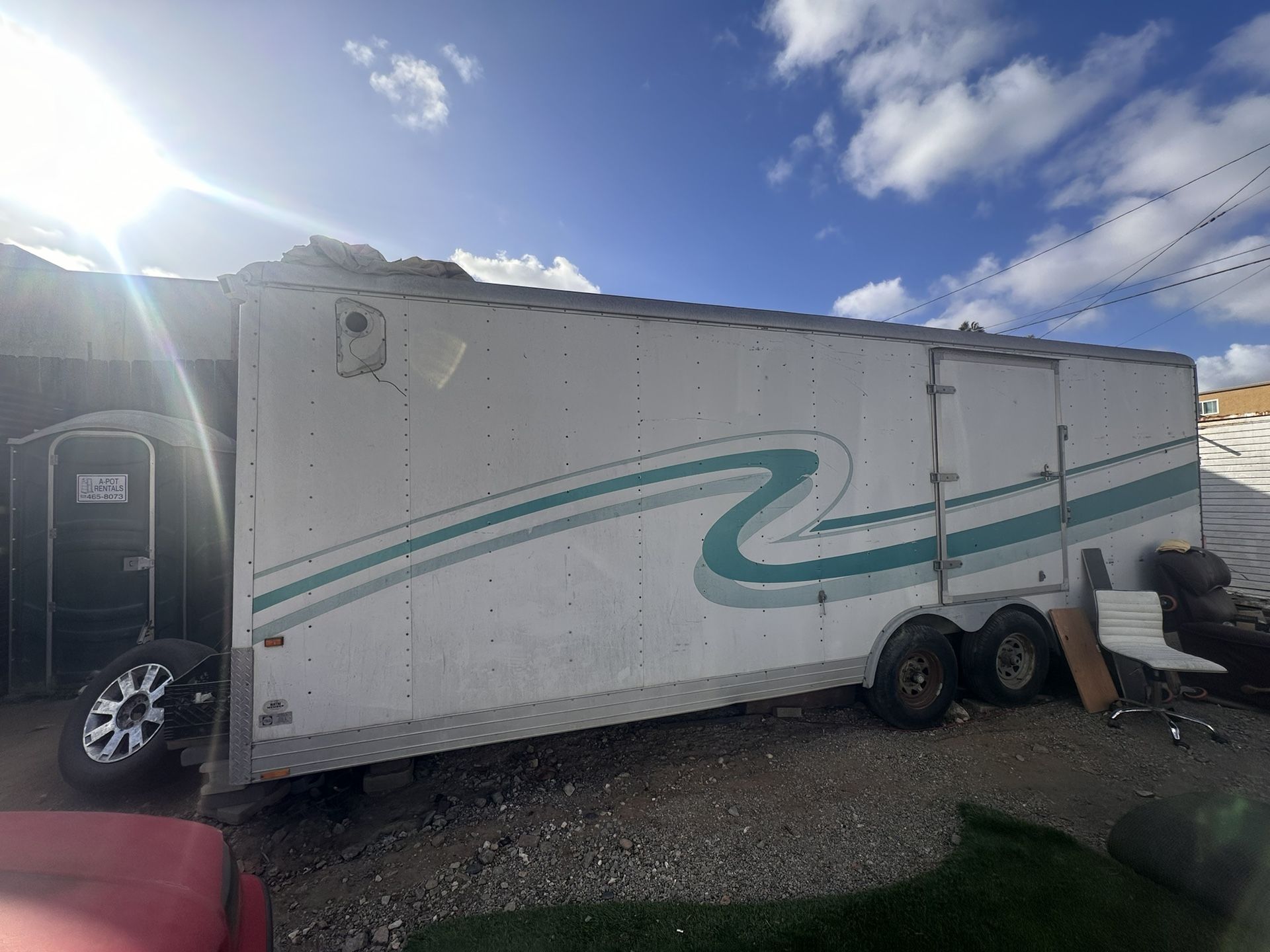 8’x24’ inside enclosed trailer 27’ total 8’ high ceiling no leaks Tires 50% thread Battery included Car loading ramps