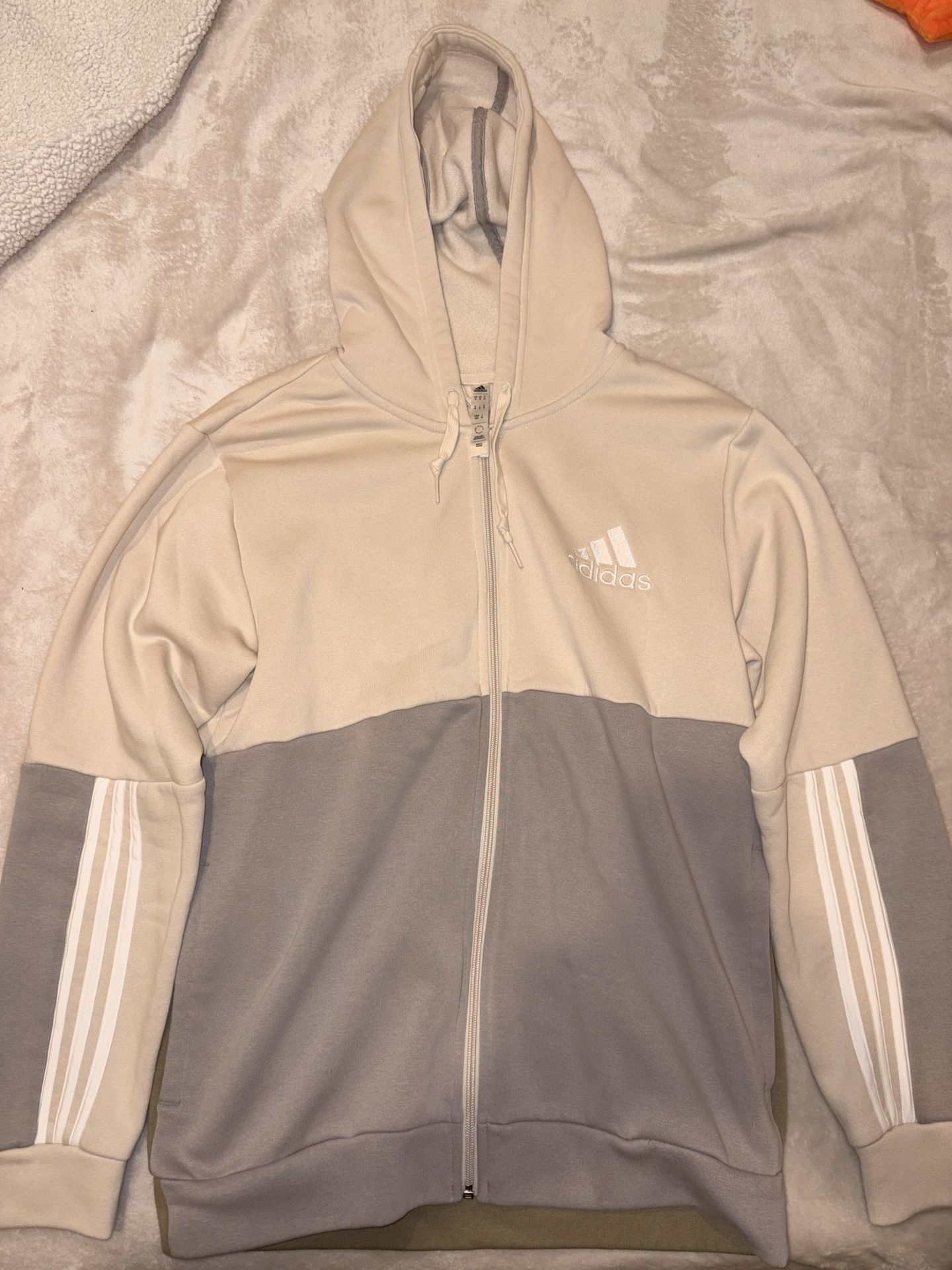 Adidas Men's Essentials Colorblock Full-Zip Hoodie in alumina and grey, made from a cotton-blend fleece. LIKE NEW hardly worn. Soft material inside & Tri-colored (cream, grey & olive green). Perfect for cool weather outside. SIZE MEDIUM but can also pass for Large. Originally $65.