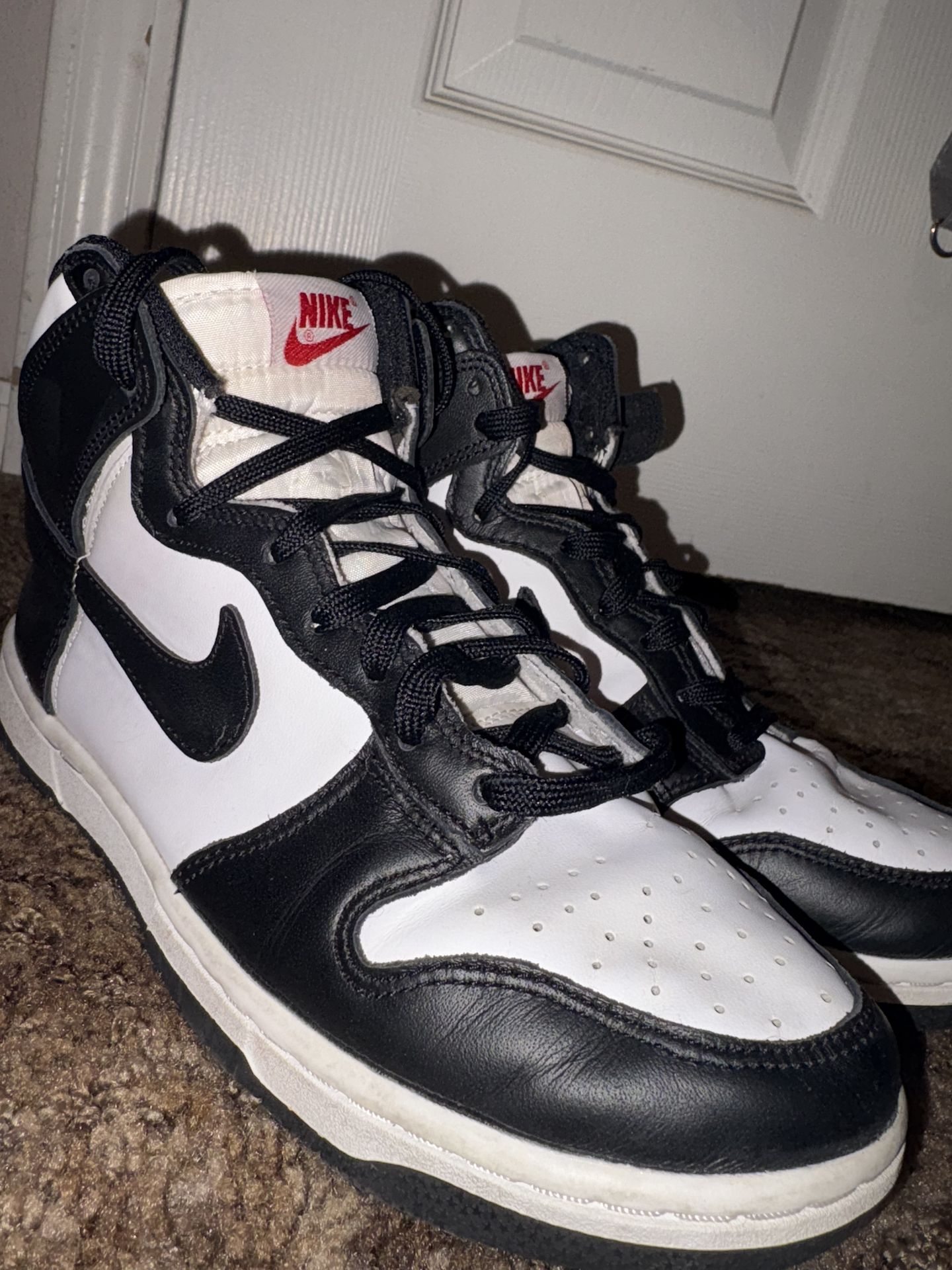 Nike Dunk High Pandas, in pretty good condition. Size 7 in women’s. I’m a size 6 and a half and they fit me. Only thing wrong is the one of the shoe laces is missing the hard part on one side