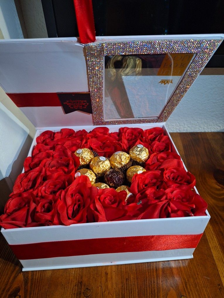 White Box With Artificial Red Roses And Chocolates Ferrero Rocher