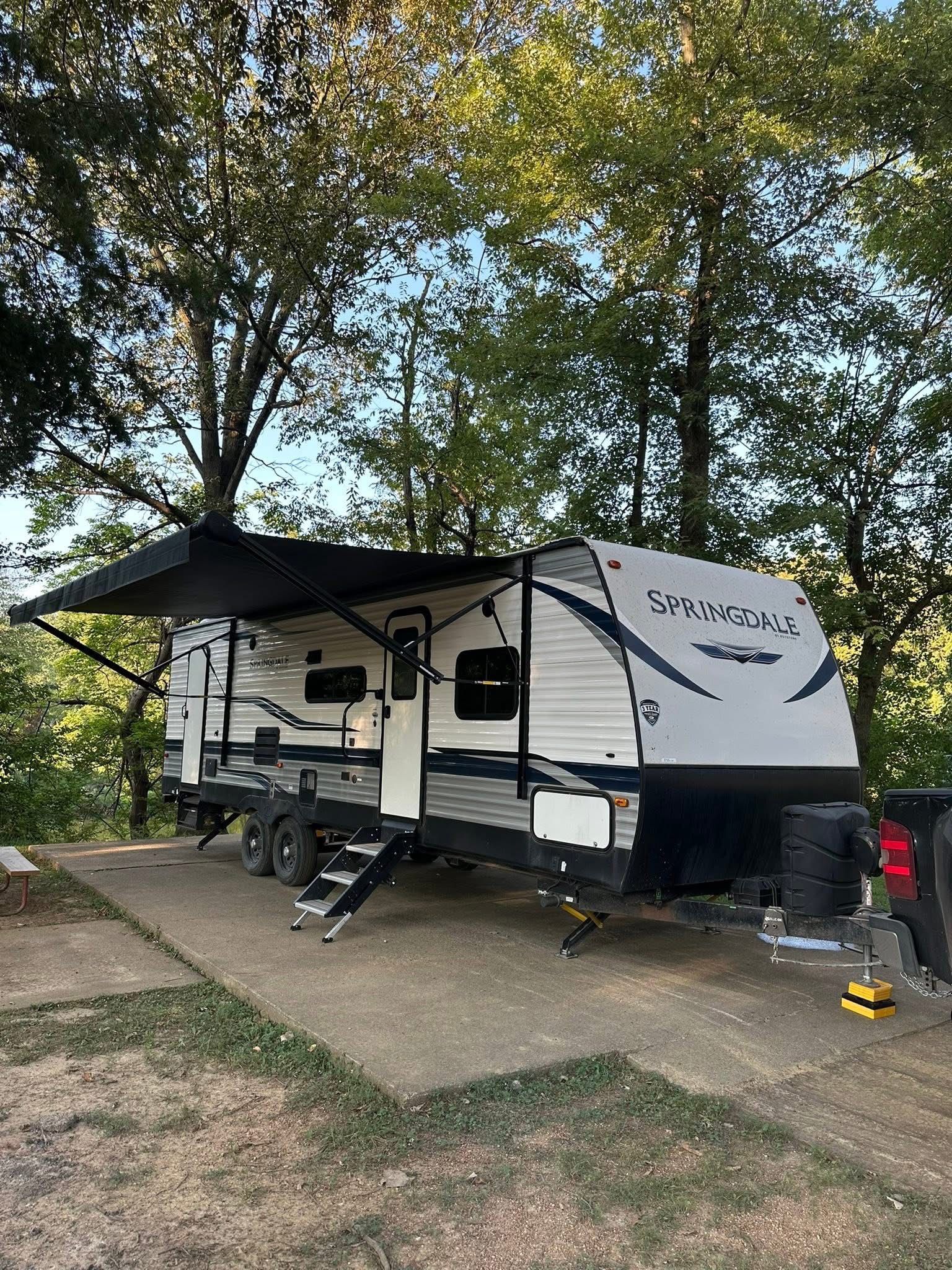 Great condition this trailer sleeps 8-10 has bunk area and master bedroom has 1 slide out and a fireplace comes with two tvs has awning and includes all maintenance records and items like septic hose and cradle this is a must see