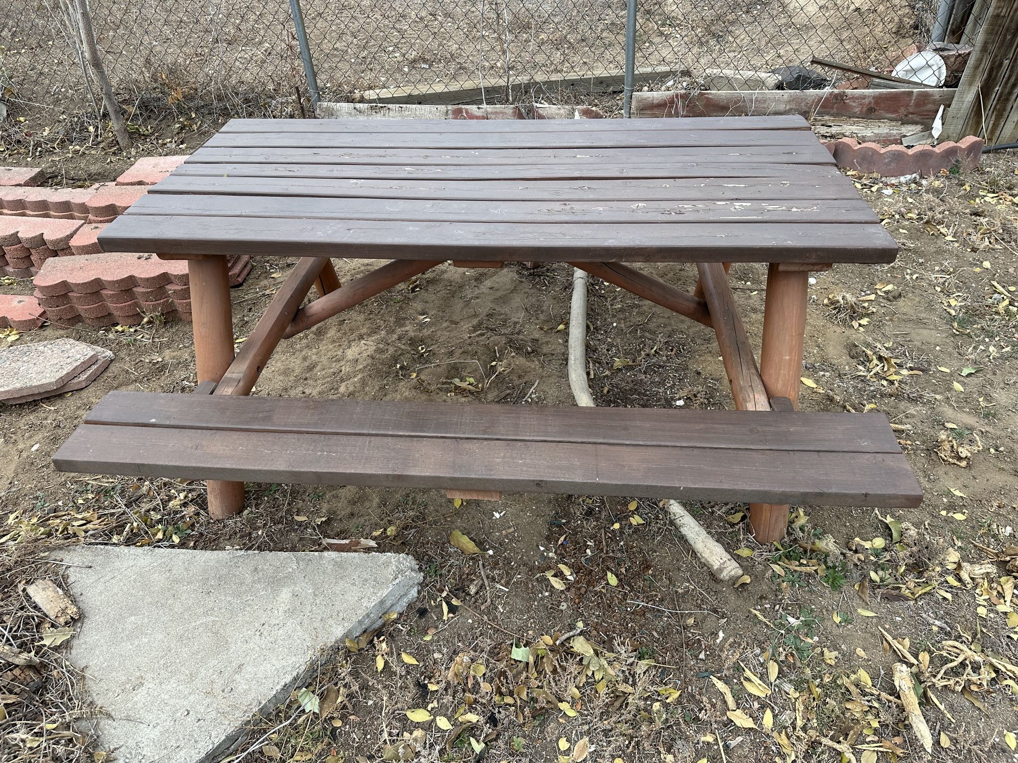 Great picnic table. The top needs to be resealed. The benches fold up which keeps them safe from weather and dirt. There’s a small amount of warping to the table edges. Everything is demonstrated in the pics. Table is structurally sound and works great. Feel free to message me with questions