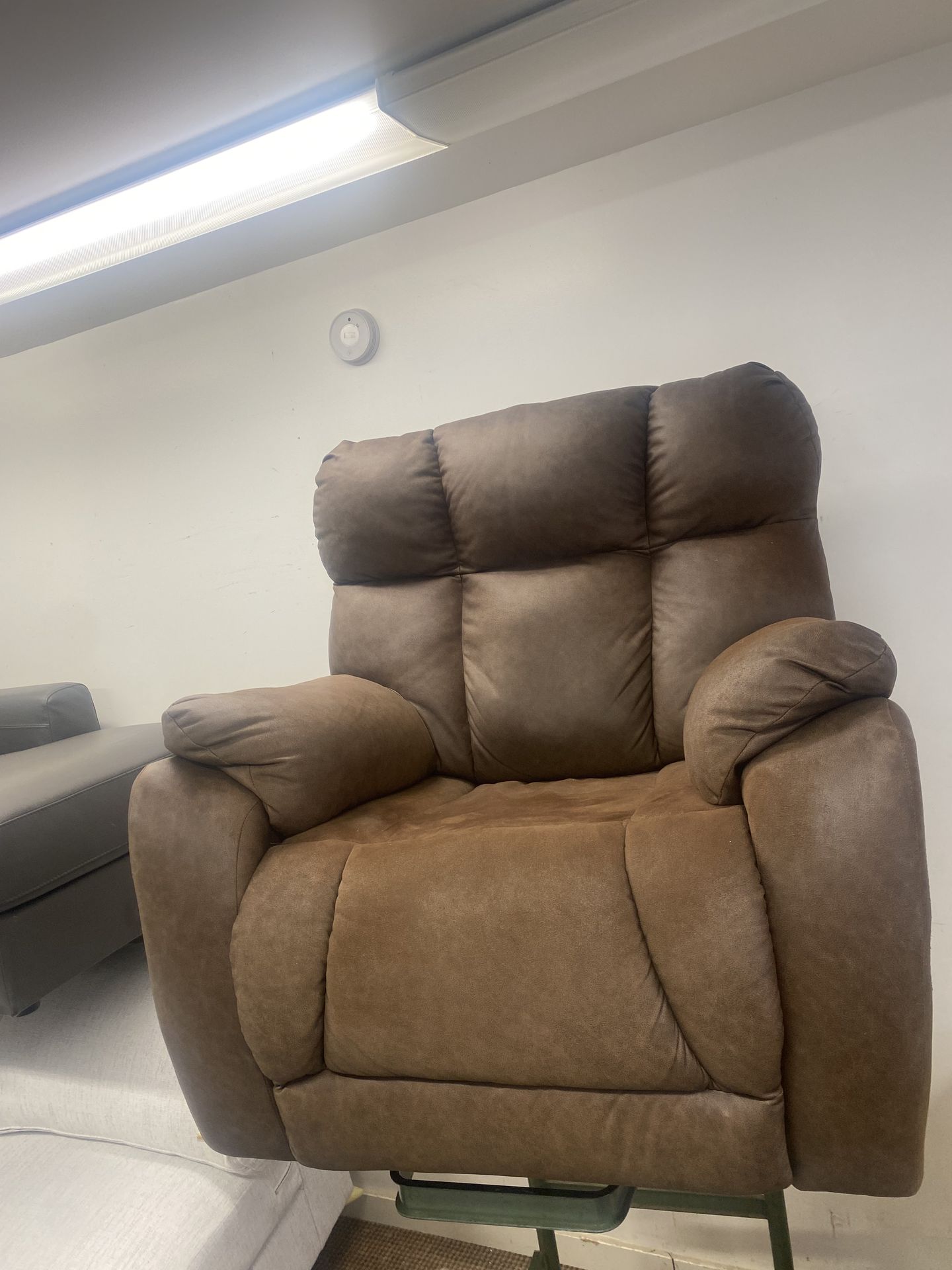 ROCKER RECLINING CHAIR COLOR: BROWN SUEDE FABRIC DIMENSIONS: 40”(W) x 41”(D) x 43”(H) FULLY FUNCTIONAL OPEN BOX/ SCRATCH N DENT/RETURN PRICE $99.99+TAX( CASH/CREDIT)