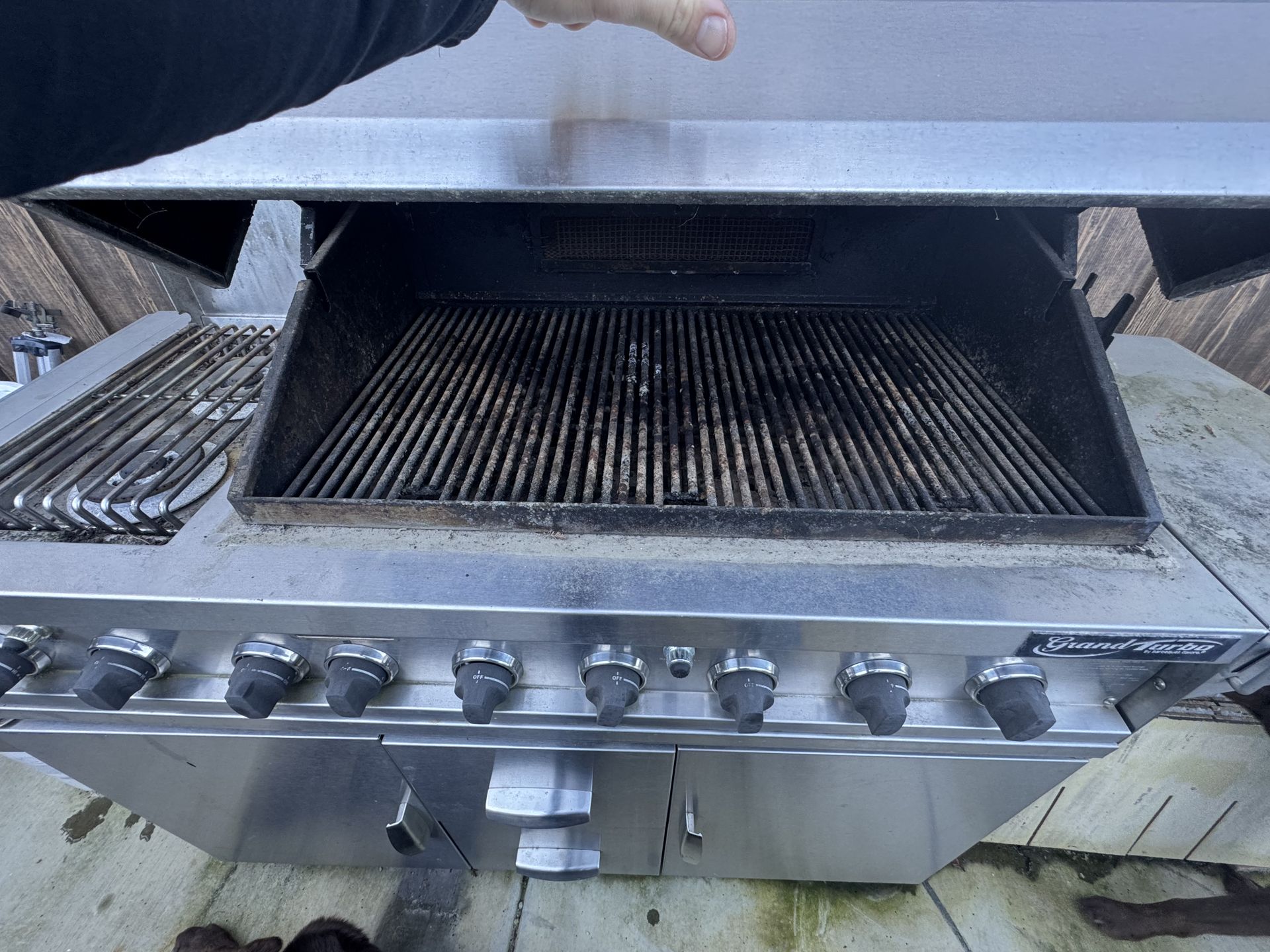 Grand Turbo barbecue. In decent condition. Everything works. Just needs to be cleaned up. We live upstairs and don’t wanna carry it up and put on our deck. We got a smaller one now.