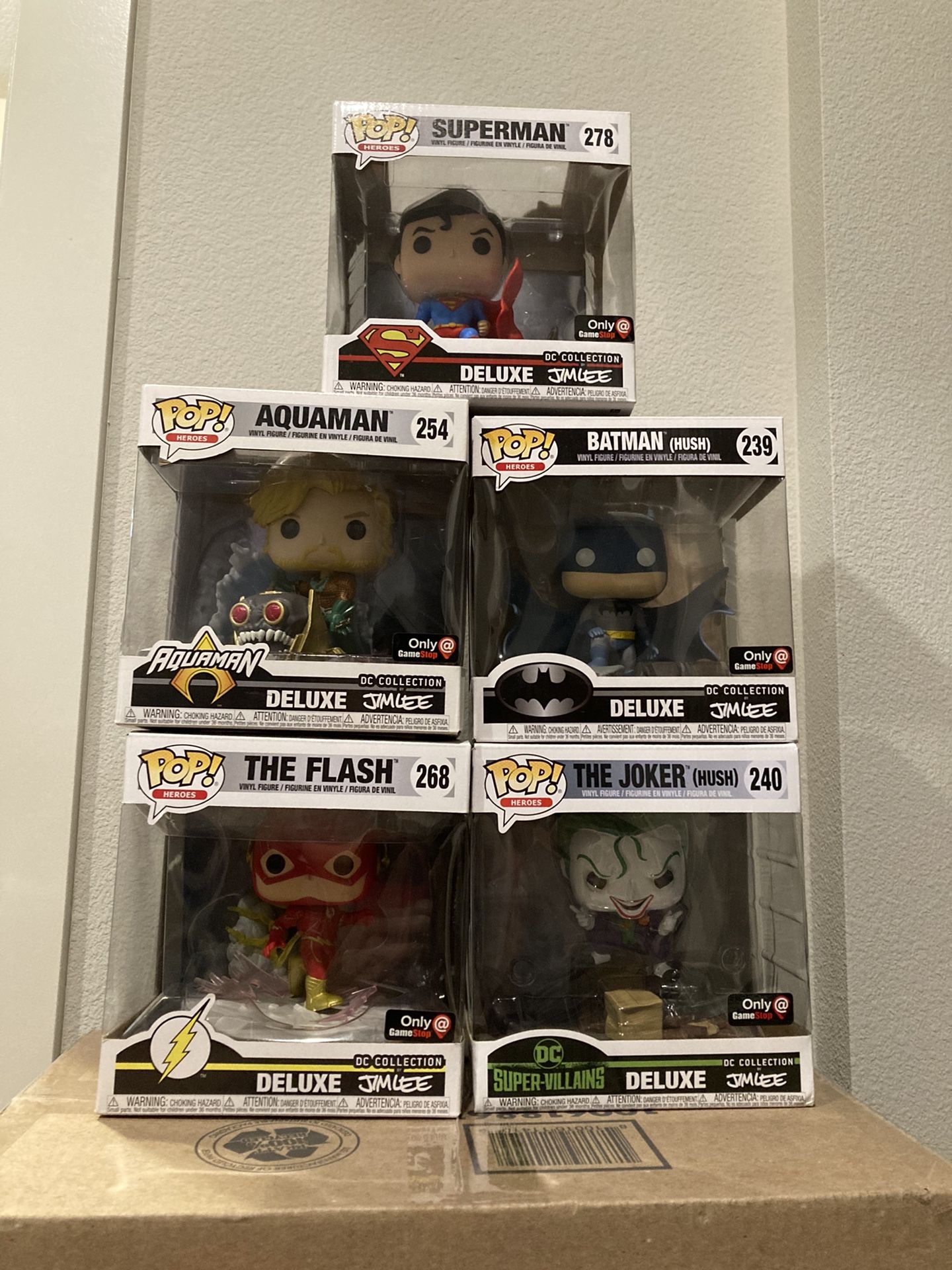 Jim Lee DC Collection Funko Pops. Game stop exclusive. Superman #278 Aquaman #254 Batman (Hush) #239 The Flash #268 The Joker (Hush) #240 Asking $100 for all