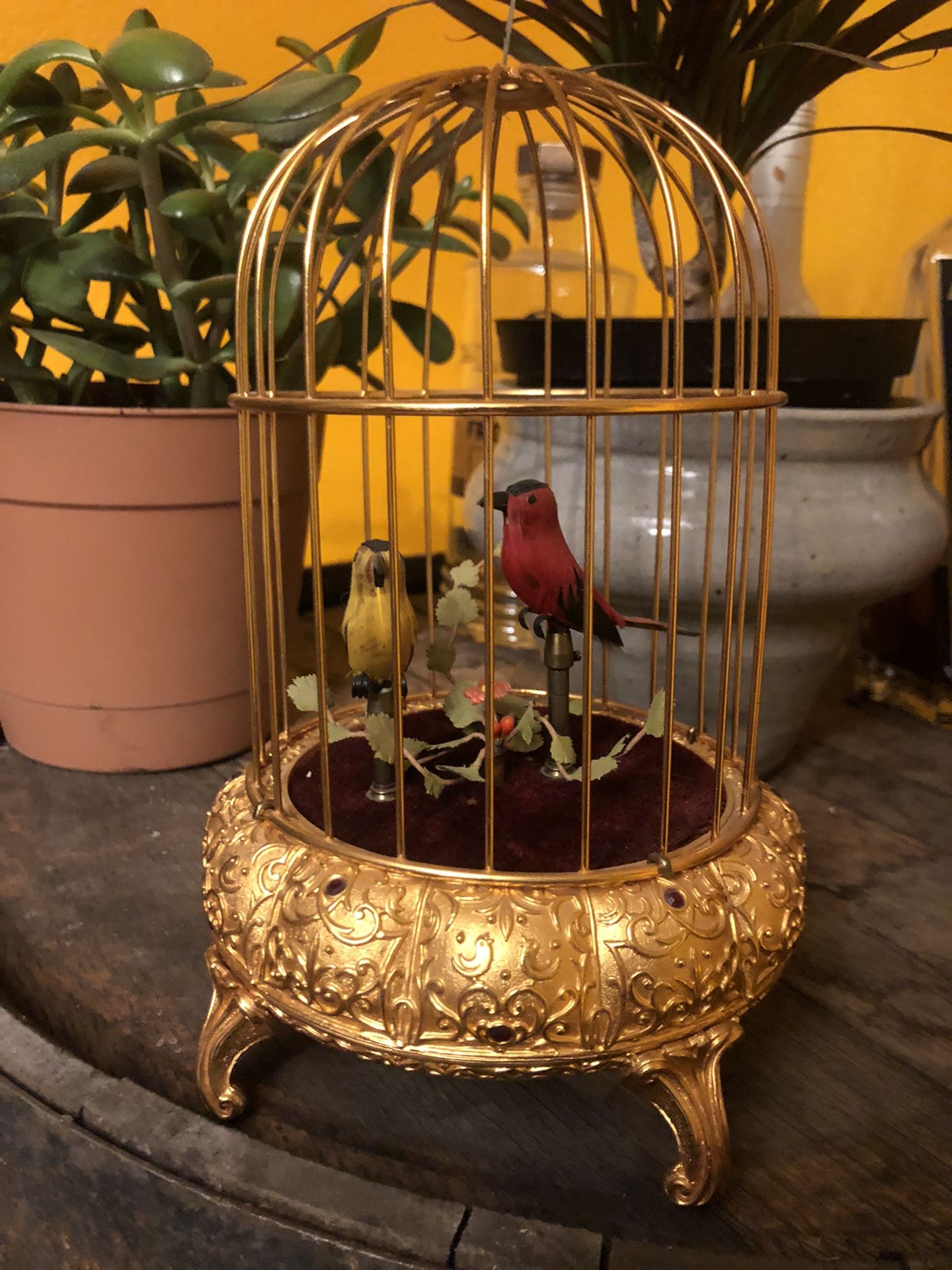 Robotic automaton bird cage made by Elpa of West Germany. I have taken it apart to clean and restore; the birds animations work flawlessly but the bellows are cracked and in need of replacement. So basically they move but don’t currently sing. Base is a bit bent from previous owner but I have set it back as well as possible. Extremely rare and collectible! Antique