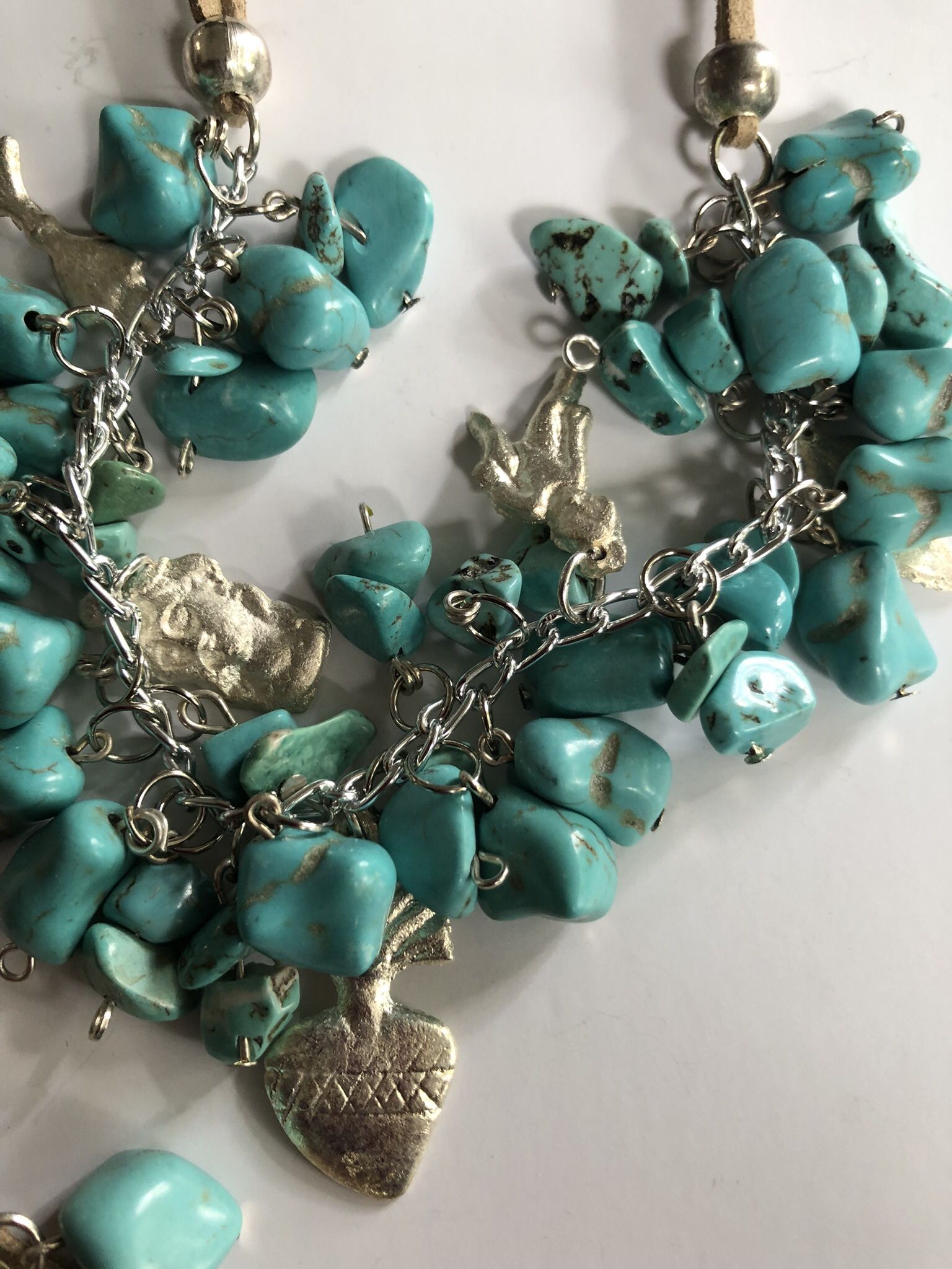 Imported from Mexico - Turquoise colored stones and silver toned charms or Milagros on a leather adjustable strap. Nice accent or statement piece. New in package. 4 available. Pick up in public place.