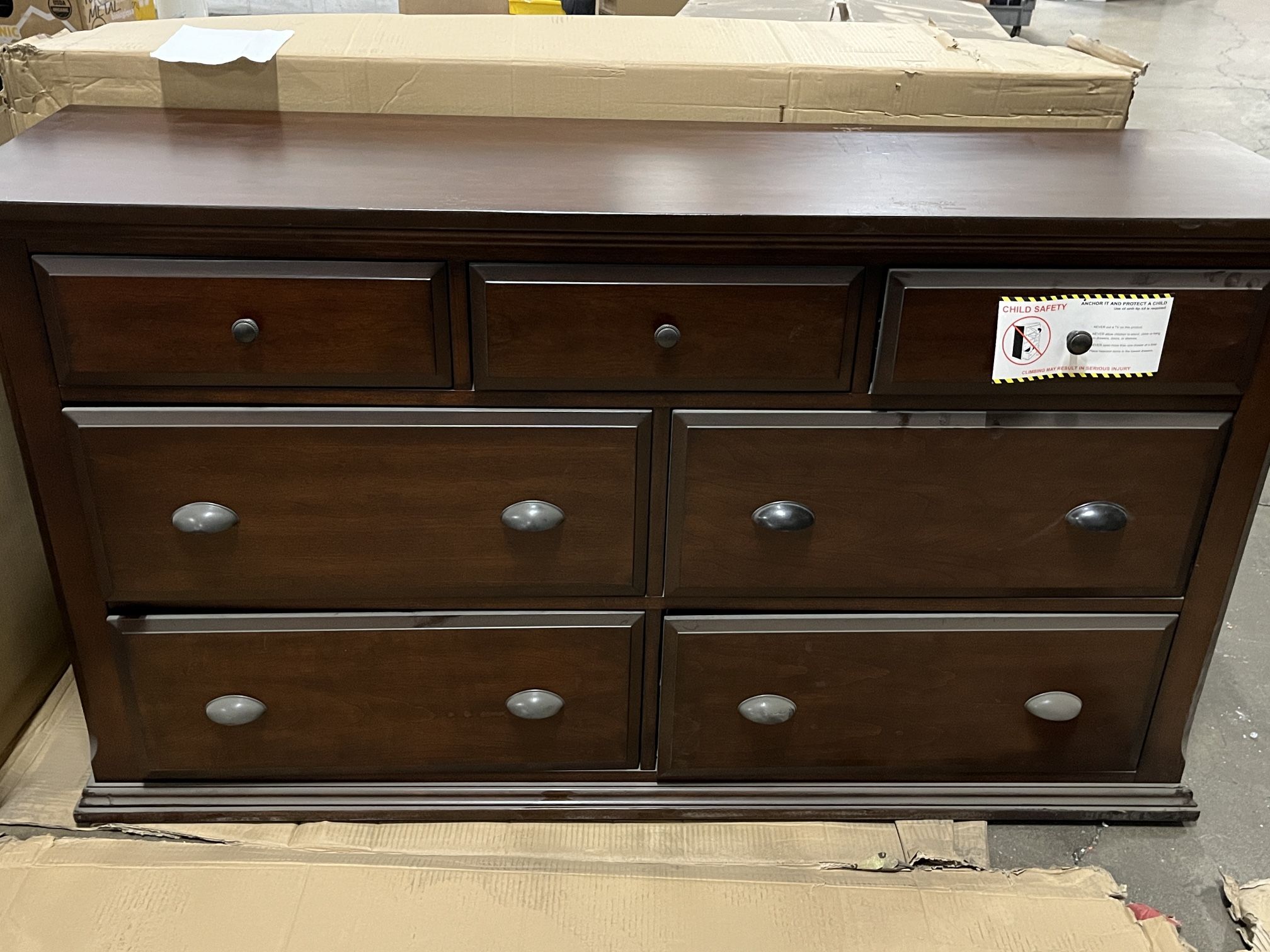 This dresser is new but suffered shipping damages. See photos for full reference. Worst dings is one of the corners. There is also a bottom piece of board that is damaged. It is not a visible piece of the dresser so can be removed and thrown away. Dusty from storage, needs a cleaning.