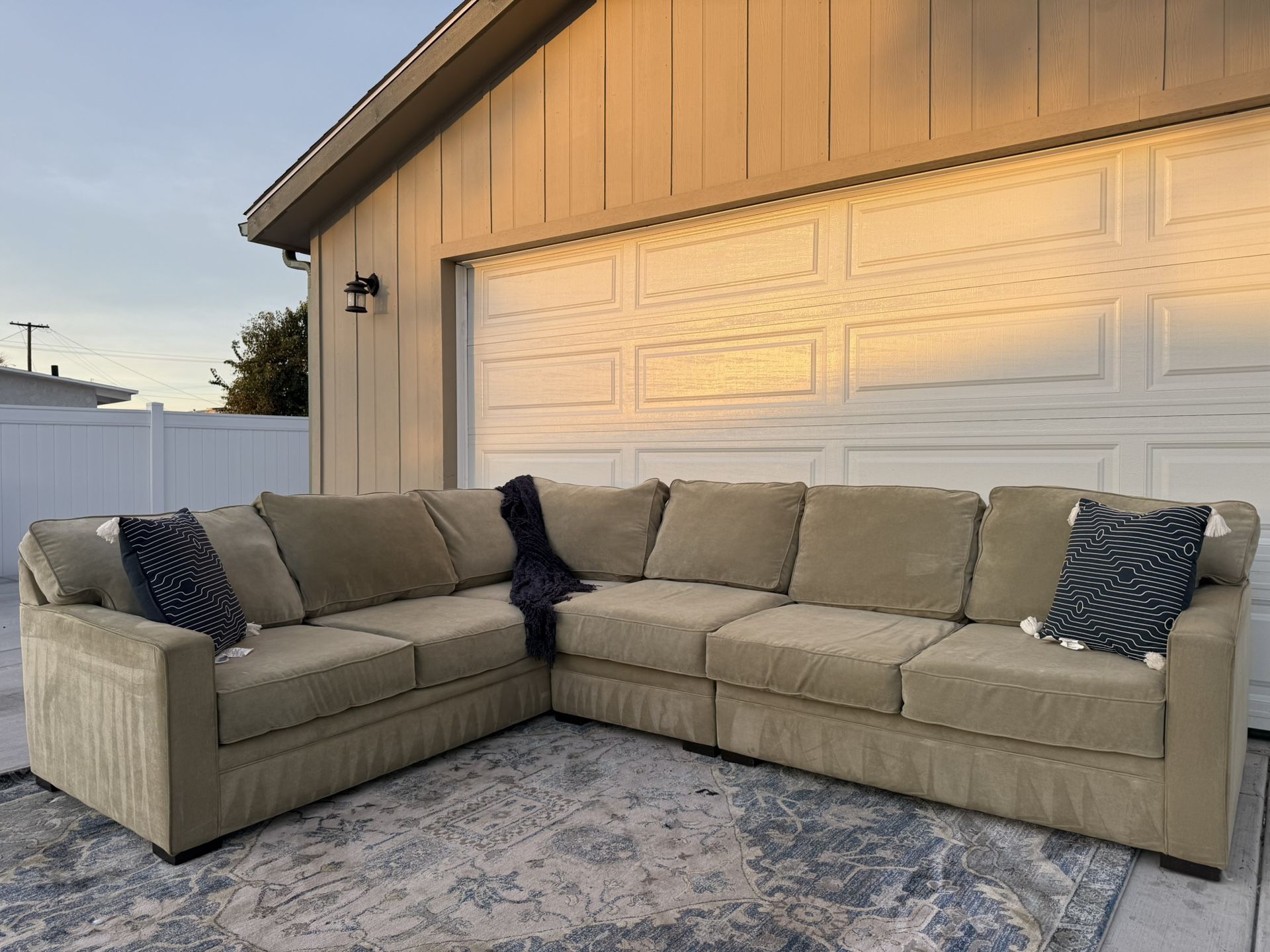 Living spaces beige sectional. Durable frame 🔸fully washed 🔸all bottom and back covers remove to wash 🔸splits into 3 pieces 🔸minor stains present see pics 🔸DELIVERY AVAILABLE Measurements 9ft x 7ft ❗️Types of payment accepted❗️ Cash Zelle Venmo Apple Pay cashapp credit or debit ❗️SEE MY PAGE FOR MORE LISTINGS❗️ Couch Sofa Sectional Sala Ashley’s furniture