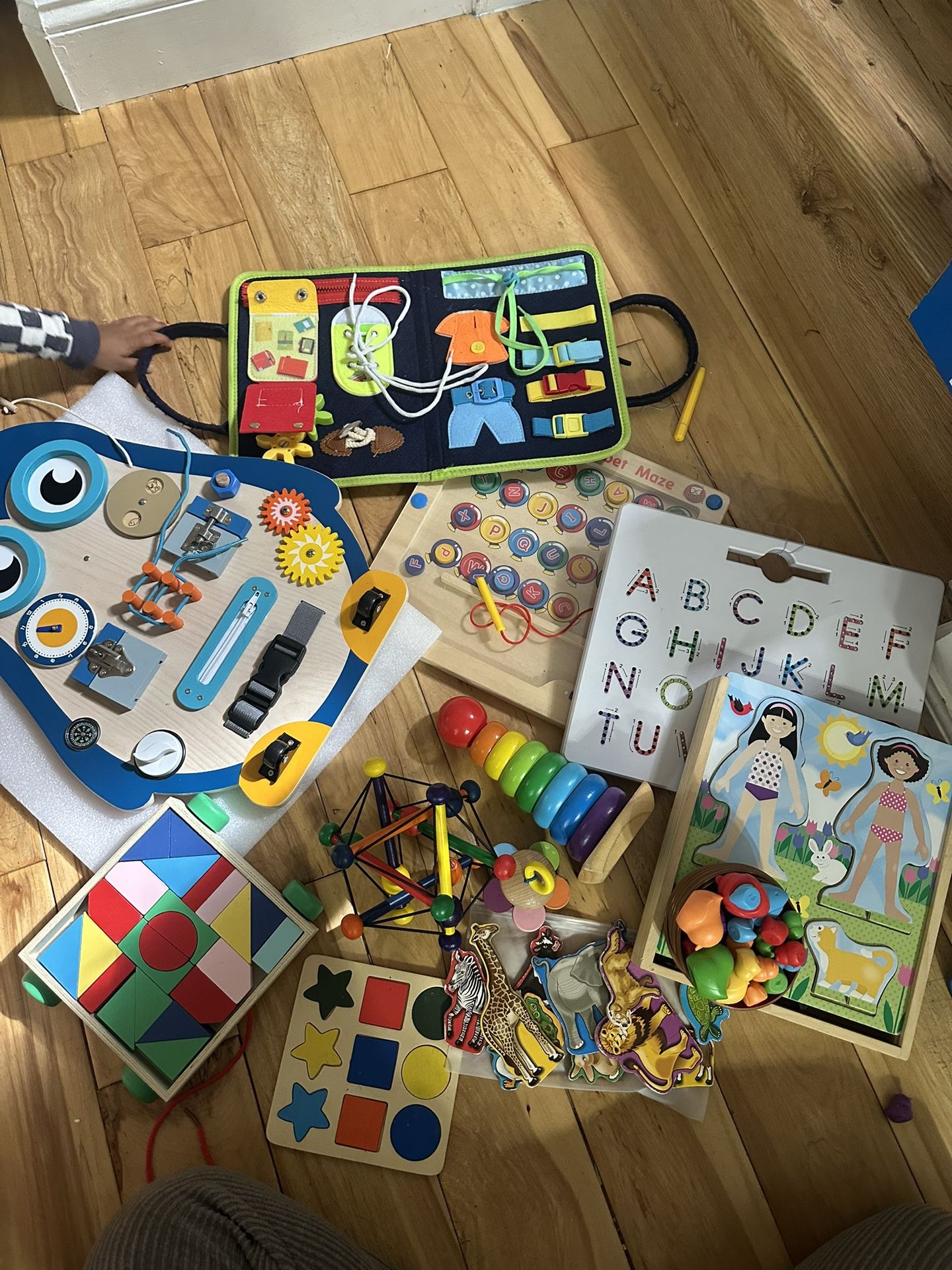 Montessori-inspired bundle and learning toys. • Brand New Wooden Busy Board • Montessori Felt Busy Book • Wooden Alphabet Magnetic Maze • Classic Rainbow Wooden Stacker • Manhattan Toy Skwish sensory rattle • Wooden Shape Sorter Puzzle • Colorful Geometric Pattern Block Puzzle • Magnetic Dress-Up Dolls • Wooden Animal Magnets • Fine Motor Peg Toy Set Perfect for ages 2–5 All pieces clean and in excellent or new condition Smoke-free home 🎁 Retails for over $160+. selling full bundle for $70 OBO