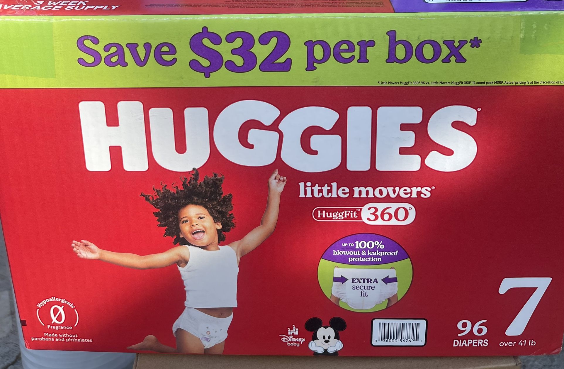 Huggies Little Movers HuggFit 360° Diapers. Size: 7, for babies over 41 lbs. Quantity: 96 diapers per box. Features: HuggFit 360° waistband for an extra secure fit and up to 100% blowout and leakproof protection. Material: Hypoallergenic, fragrance-free,