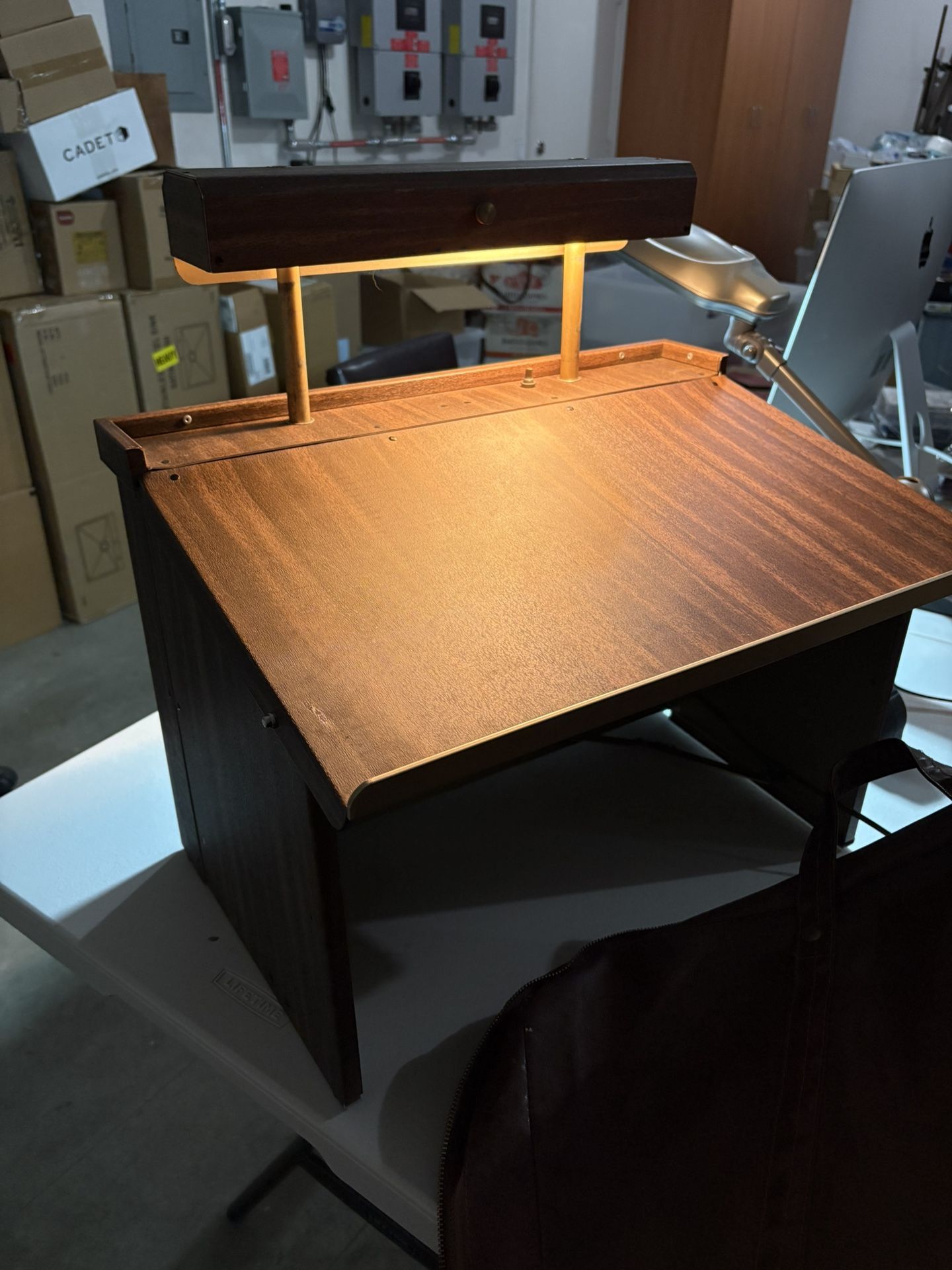 Elegant wood & metal podium desk with brass accents and lighting. Portable with carrying case. Sides fold in, light retracts, top folds down, slides into zippered carrying case with handle.