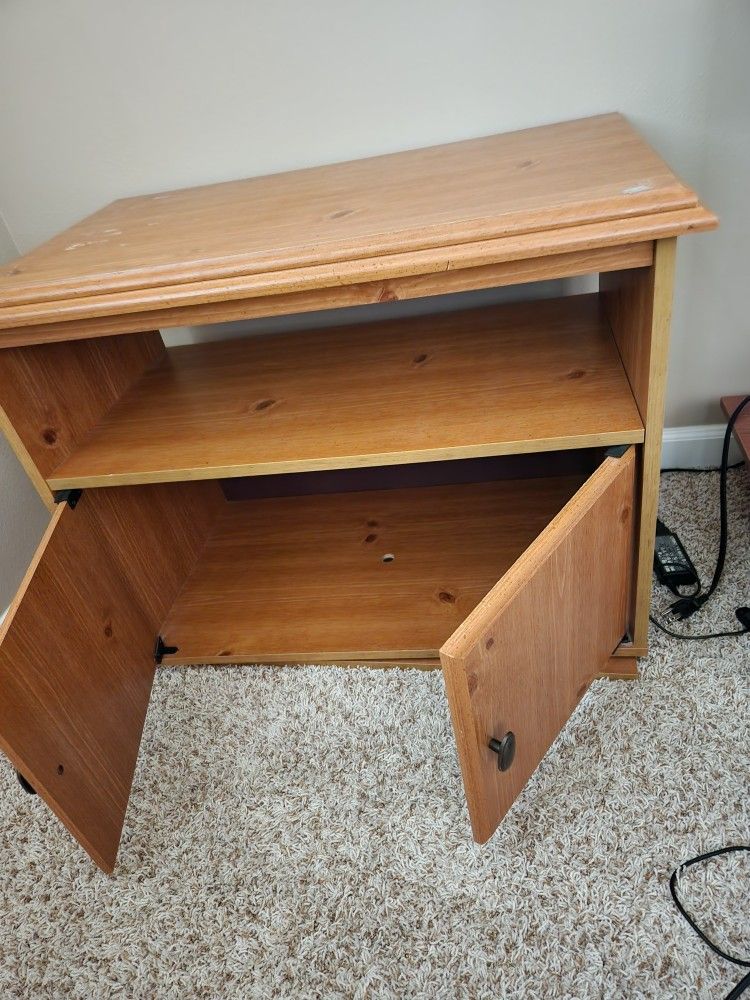 Wooden swivel cabinet with shelves and lower storage space (approx. 2ft.6" wide. 1ft.8" long and 1ft. 11" high) , black cabinet on wheels with glass door (can be used for TV, computer or displays). (approx 1ft.6" long, 3ft wide and 1ft.9" high). Small wood table (approx 1ft.1 " long, 2ft wide and 1ft 10" high). All in excellent condition . Free for pick up only.
