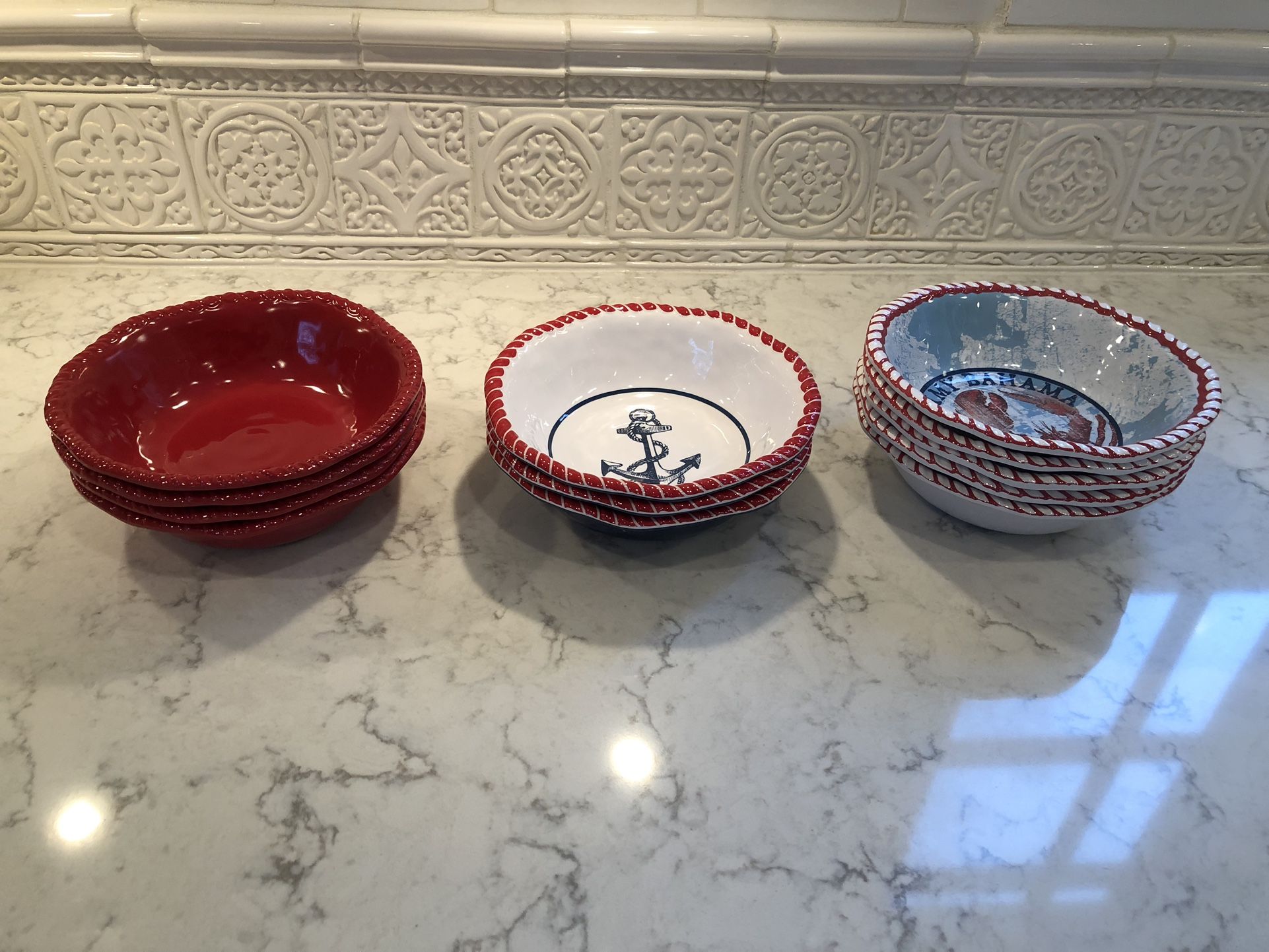 12 TOMMY BAHAMA MELAMINE LOBSTER/NAUTICAL 8” BOWLS-SEE LISTING FOR MATCHING PIECES In this listing, there are four red 8” bowls, three red white and blue 8” anchor bowls and five 8” lobster bowls. They are meant to be mixed and matched. More fun that way. They all come from the same line. All these pieces are brand new, never used, but some have tags and some don’t. I think I started taking tags off when I planned on keeping them. They were never used and now I’ve decided to let them go. I have way too much stuff. In a separate listing, I will be selling 12 Tommy Bahama lobster dinner plates, 12 Tommy Bahama lobster/anchor/red 9” plates and 7 gorgeous platters. All new. Some with tags, some not. I had to drive all over to complete this set. Now you can buy them all from one place. Not to mention pay one shipping fee. If you have any questions, please send me a message. Please add me to your sellers list as I will be posting some fantastic items. Thank you for looking.