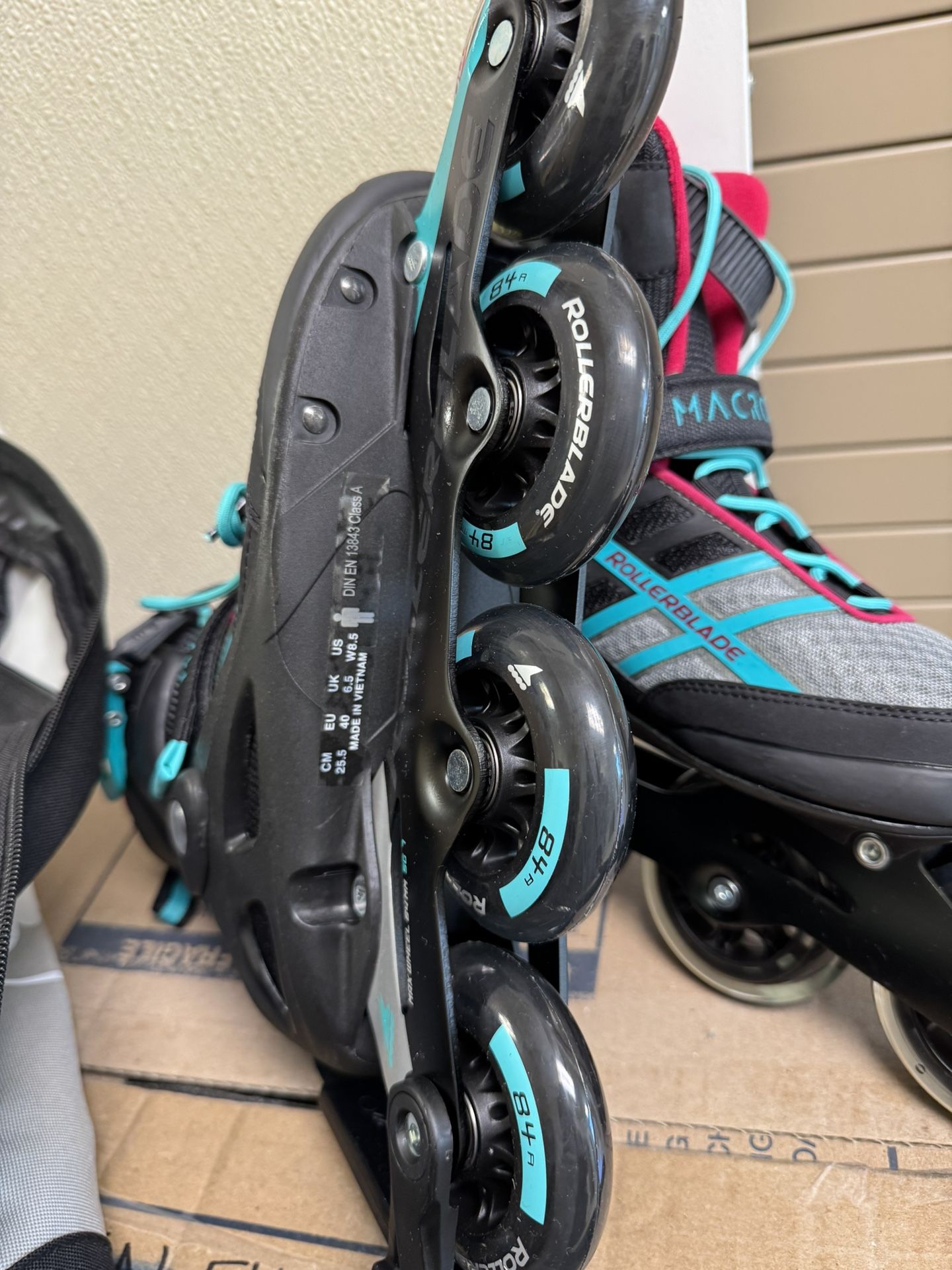 High-quality inline skates with vibrant design. Women’s size 8.5. Brand new; comes with carrying case & wrist guards
