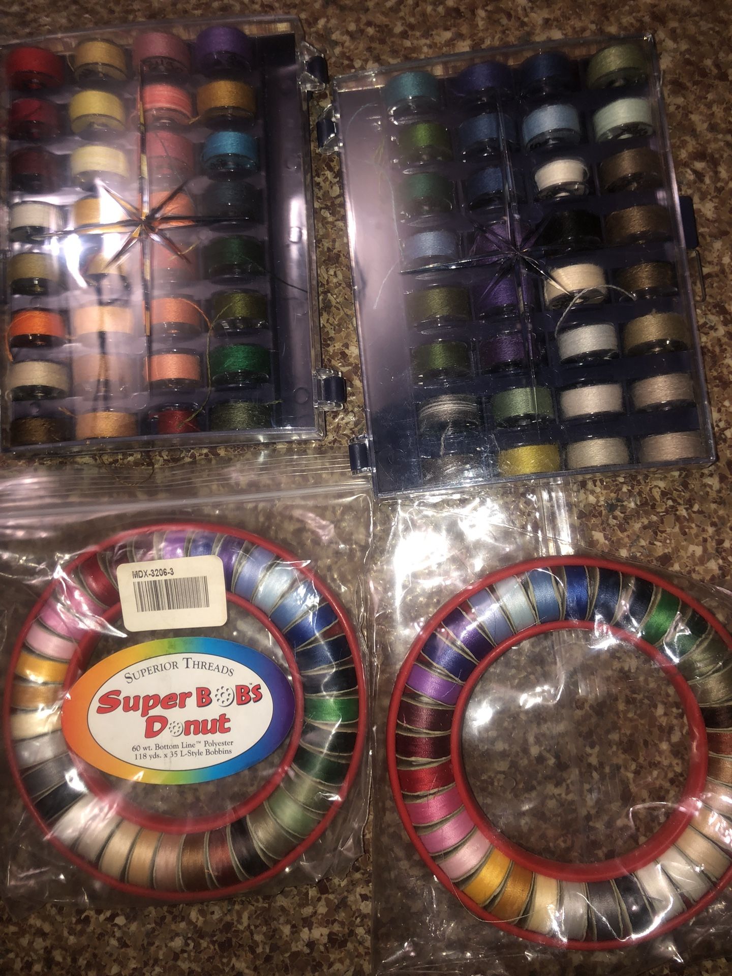 The Super Bobs Poly& Donut consists of 35 unique colored, L-style pre-wound bobbins with cardboard sides, packaged in a Bobbin Saver. Each bobbin is wound with 134 yds. of 60 wt. lint-free polyester thread for a total of 4,690 yds. With additional two 32ea cases of polyester thread never touched still in retail packaging Brand new .