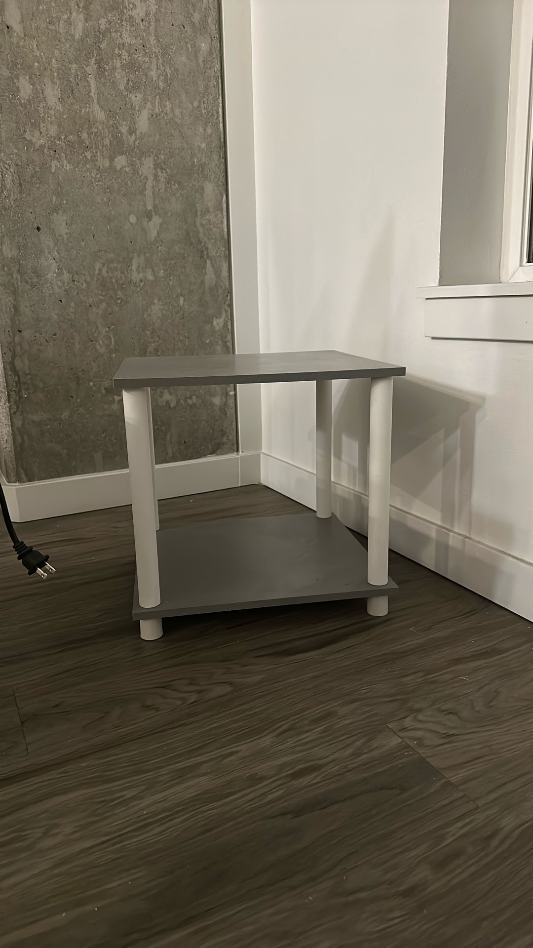 16 inch tall square gray and white plastic end table or side table. Great condition.