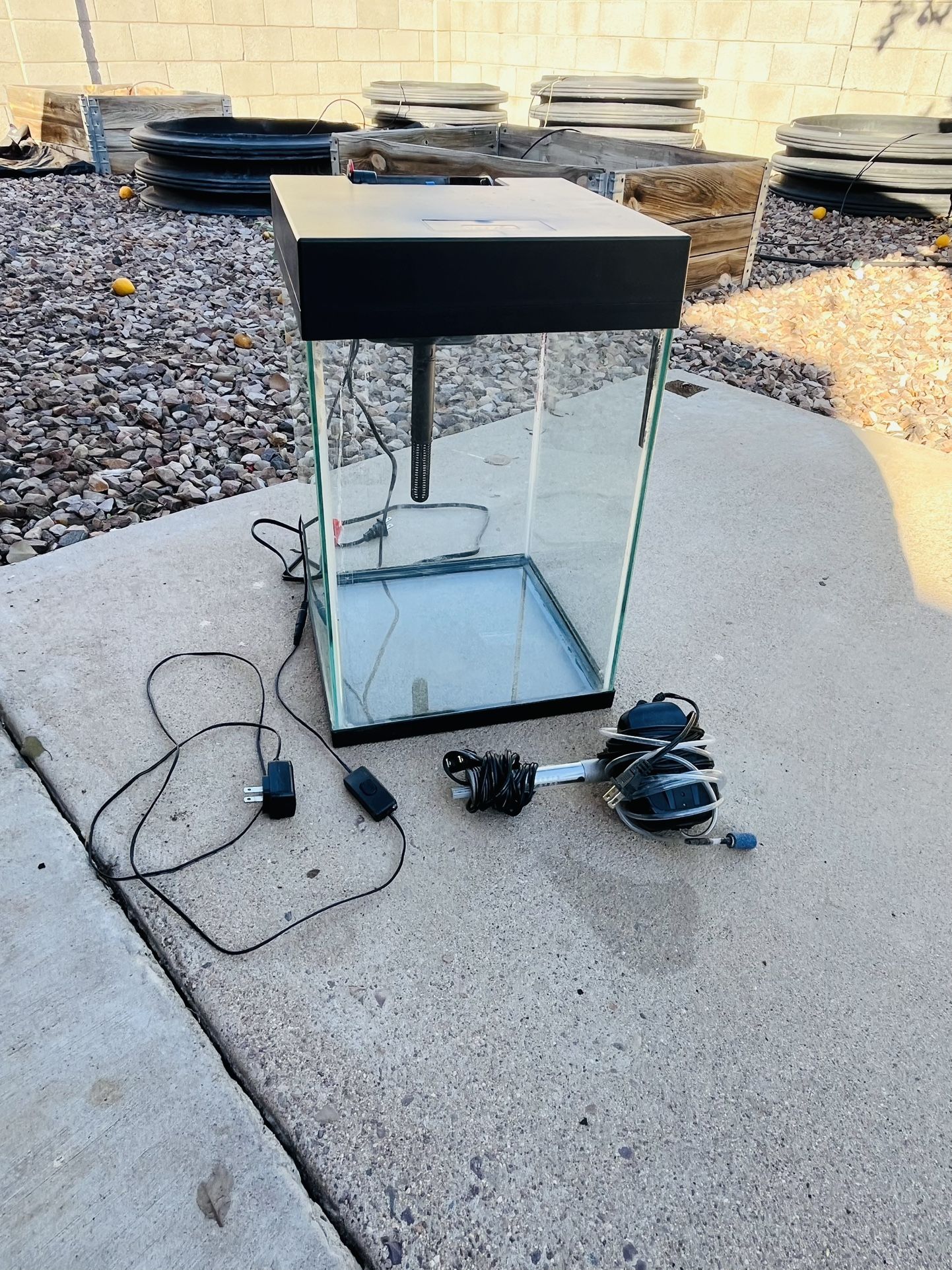 -10-Gallon Glass Column Hexagon Aquarium -Hood with Feeding Door -Bright White LED -Thermometer -50 Watt Heater -Silenstream PF10 Power Filter with cartridge -Aqua Culture Charcoal Filter Color: Black, Clear Product Dimensions: 12.5 in L x 12.5 in W x 19.5 in H (31.7 x 31.7 x 49.5 cm) Capacity: 10 Gallons (37.8 L)