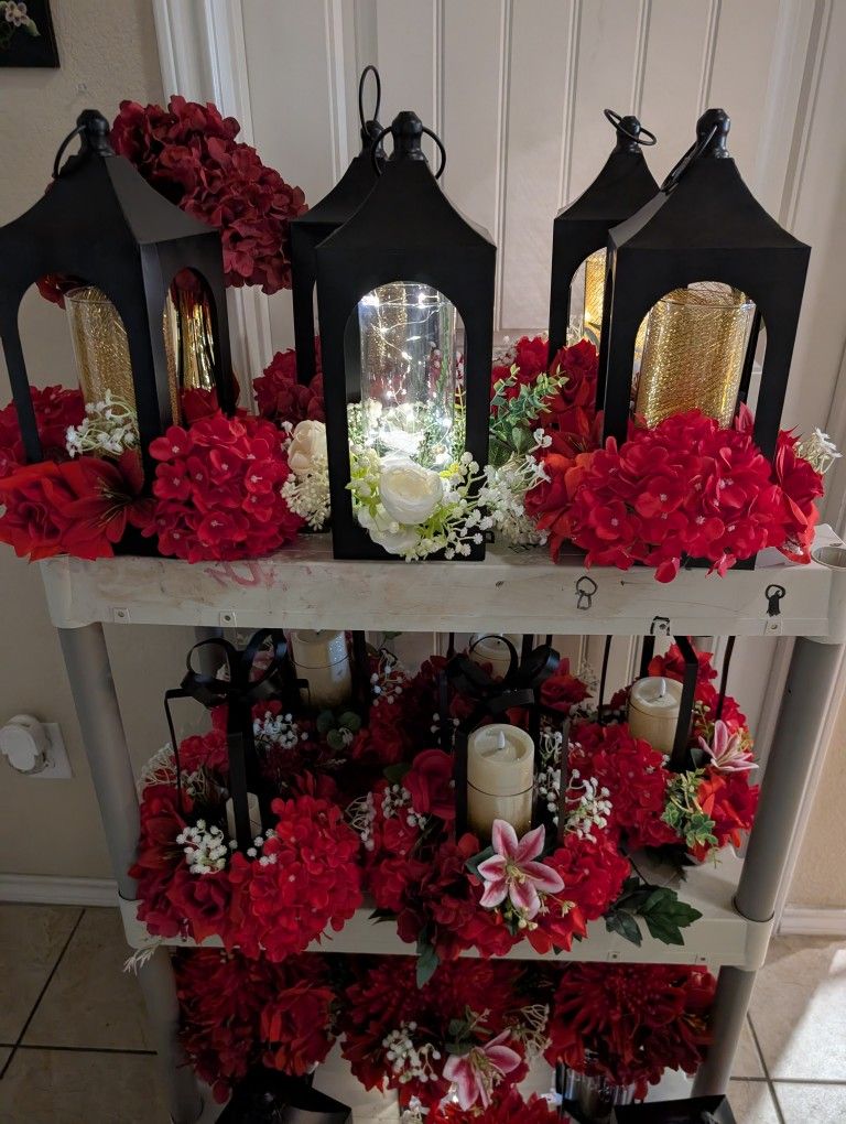 I made all of these for my daughter's quinceanera. Different options for variety. 6 candelabra Red flower. 1 white flower: 5 Present looking ones 4 square ones. 1 stand alone Cake stand 18inch Cup cake/fruit stand Floral runner Table signs You will need a hot glue gun for touch ups. And LED light for extra twinkle. Looking for $350 All