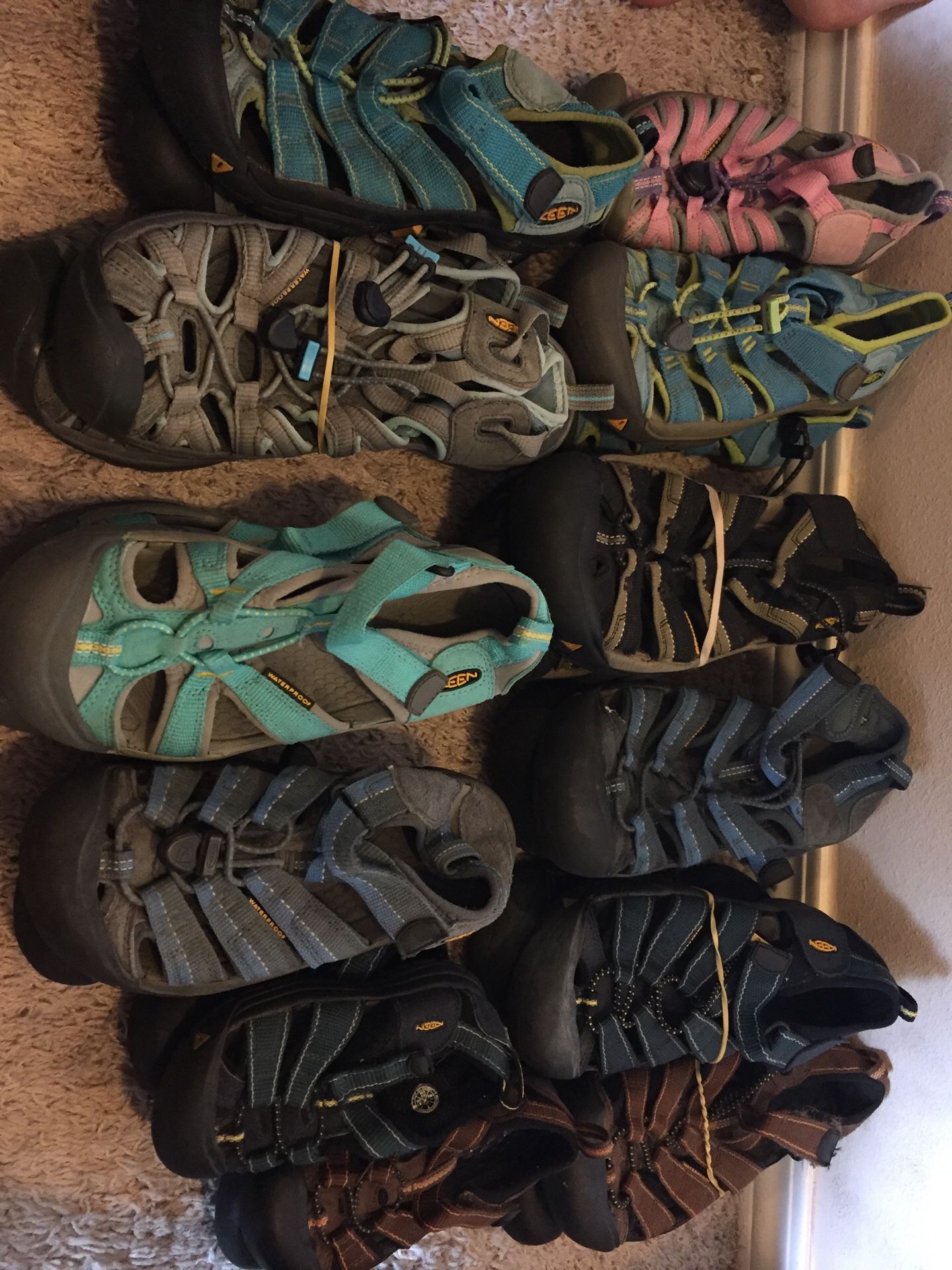 Back row Pink - child 11 Teal and green - size 4 Black and green - men’s 8 women’s 10 $30 obo 2 Sade’s of blue - size 5 child Navy blue - size 3 child Brown - size 3 Front row Teal and green - size 2 Gray and blue - size 5 Teal and grey - size 2 Two tone blue - size 1 Navy blue - size 7 Brown - size 8 $20 each obo