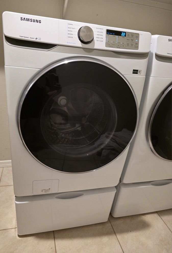 Samsung Electrical washer dryer set with pedestals. Comes with hoses. Selling due to relocating, only 2 years old. Washer does have some marks in top as seen in photo. Still in great working condition. Cash only and must pick up.