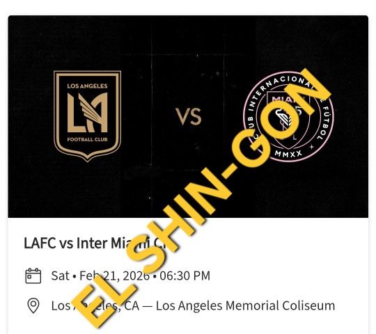 I'm selling 2 Season tickets LAFC vs. Miami Wednesday 2/21/26 at 6:30pm Seats are in section 212 Row 17 At the LA Coliseum Price $250 EACH PICK UP IN MONROVIA Tickets will be transferred through LAFC app If you are interested Please text me PLEASE CHECK MY OTHER OFFERS THANKS