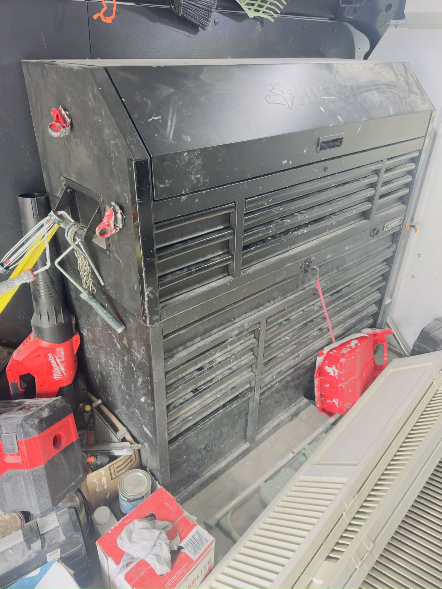 Husky Tool box. The big middle drawer has the tracking system broken. You can replace from Home Depot.