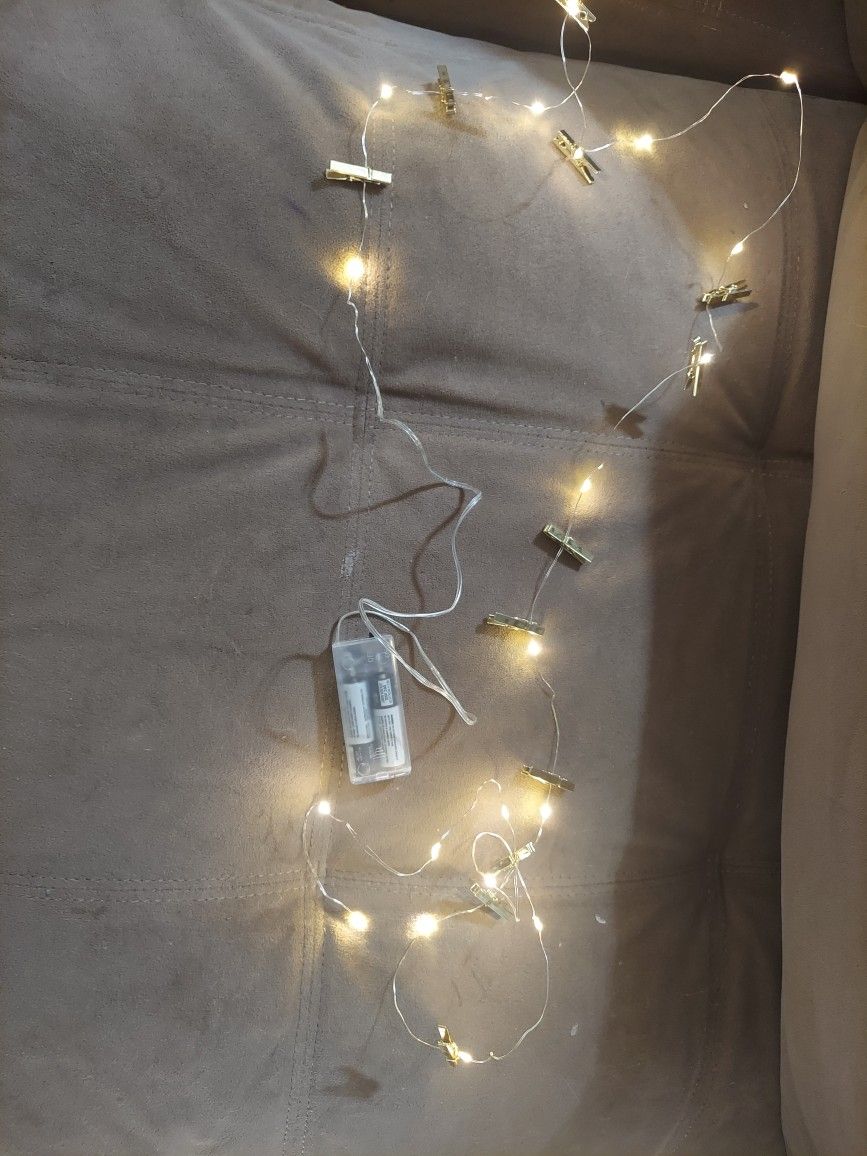 Battery operated photo string light set. Has clips to hang photos from. Uses double a Batteries. Used for daughters bridal shower to display photos of her and the groom to be.