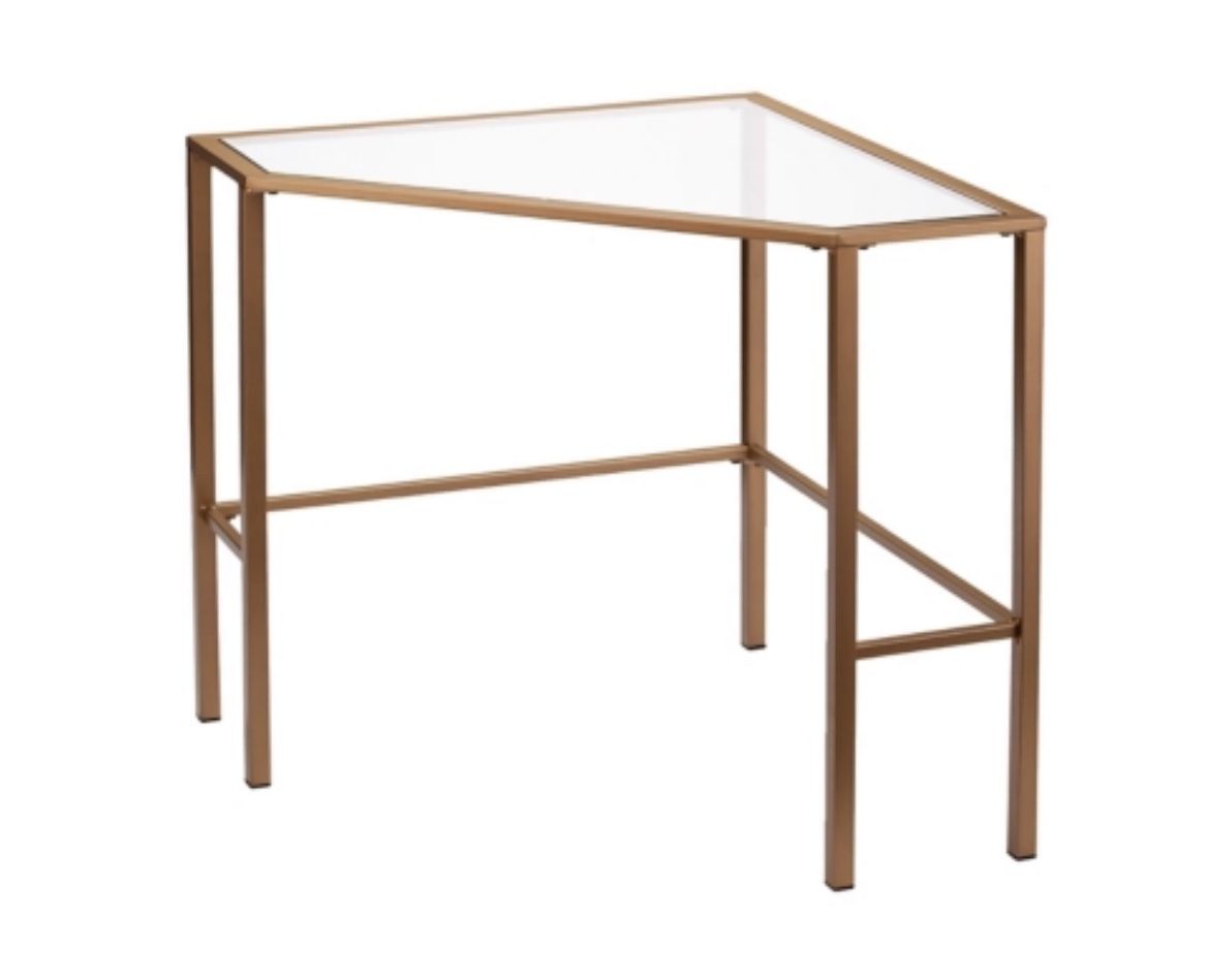 Brand new. Assembled. $80. Metal glass and gold corner desk.