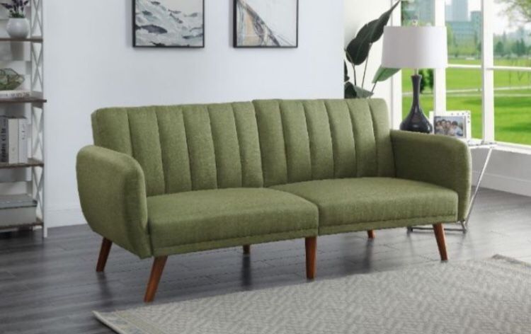 Green linen like fabric adjustable sofa futon bed $379 AC57194 Features: Bernstein Collection Sofa Color Green Material Wood, Linen Wood Leg Convertible from Sofa to Sleeper Country of Origin Shenzhen Traditional Style Some Assembly Required Dimensions: 76"L X 31"W X 33"H